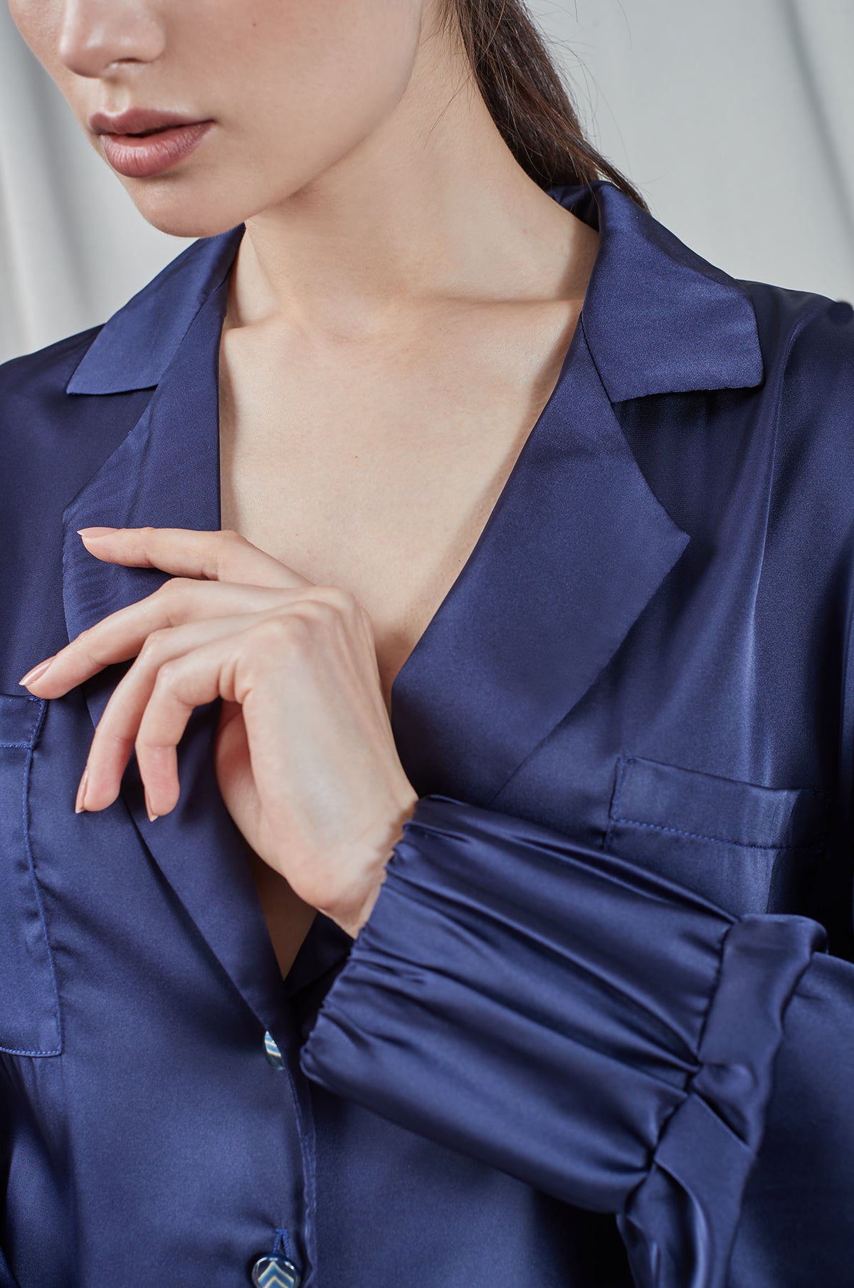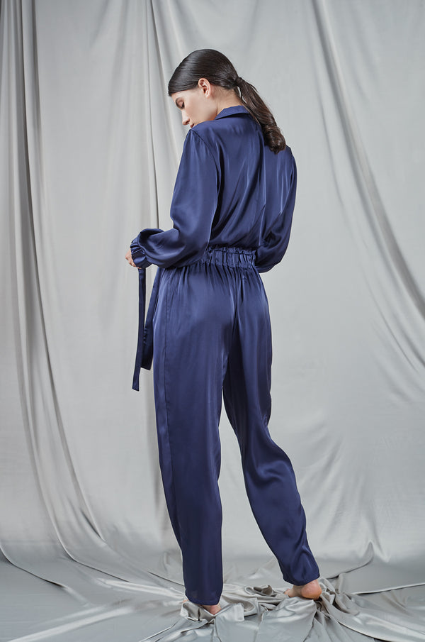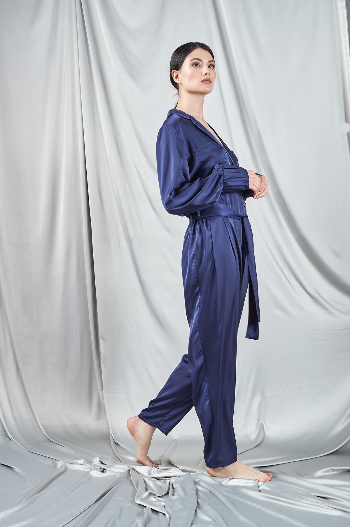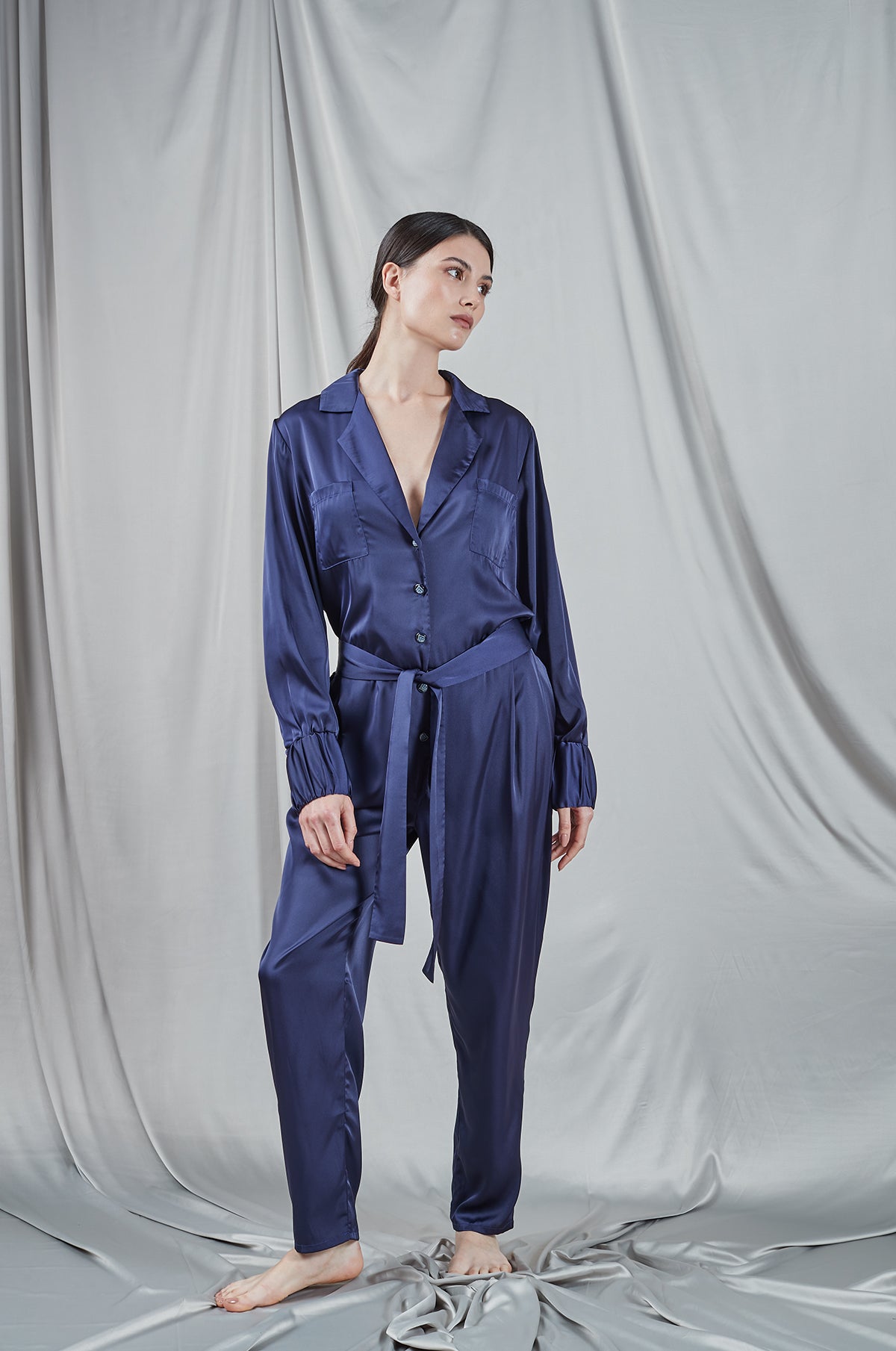 Ein marineblauer Satin-Pullover, ein Kleidungsstück, das einen Hauch von lässiger Eleganz und Raffinesse ausstrahlt. Er besteht aus einem hemdartigen Oberteil mit langen Ärmeln, einem klassischen Kragen und wird vorne mit Knöpfen geschlossen, was ihm einen klaren und raffinierten Look verleiht. Die Taille wird durch einen passenden Gürtel akzentuiert, der zur Betonung der Silhouette gebunden werden kann. Die Hose im Palazzo-Stil hat einen geraden Schnitt, der der Oberlinie schmeichelt, sie verlängert und mit seiner Leichtigkeit einen Hauch von Komfort verleiht. Dieser marineblaue Jumpsuit ist eine gute Wahl für alle, die Komfort mit schickem Stil kombinieren möchten.