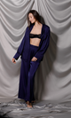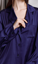 P Pyjama-Set mit klassischem Design und einem Hauch von unbestreitbarer Eleganz. Es besteht aus einem langärmeligen Oberteil und einer langen Hose, beide in einem tiefen Farbton von Marineblau. Der Pyjama ist aus Seide gefertigt, die ihm eine fließende Textur und einen subtilen Glanz verleiht