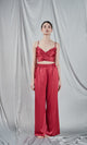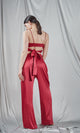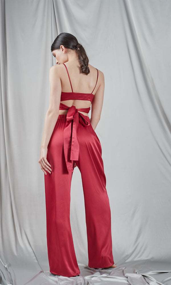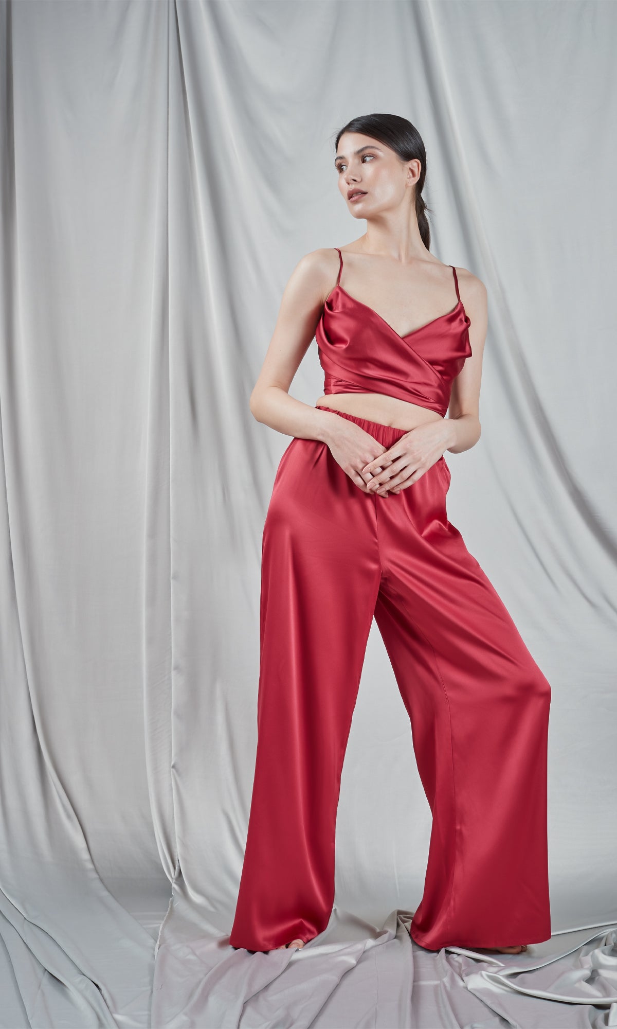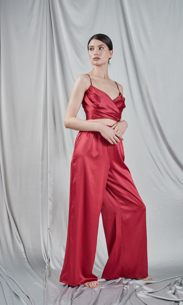 Burgundy-colored satin top in an elegant design. It features thin straps and a V-cut at the bust for a refined and feminine look. The wrap waistline and cinched detailing at the waist accentuate the silhouette, while the satin silk finish adds a touch of luxury and sensuality. This top is versatile and can be easily paired with each other, making it ideal for a variety of occasions, from a special evening out to a formal event