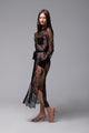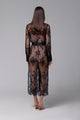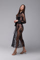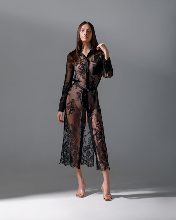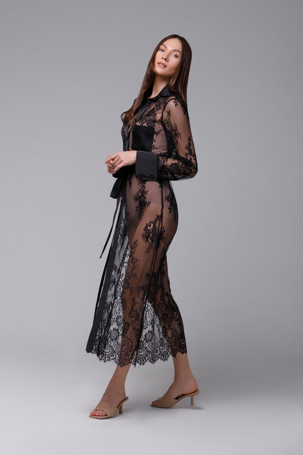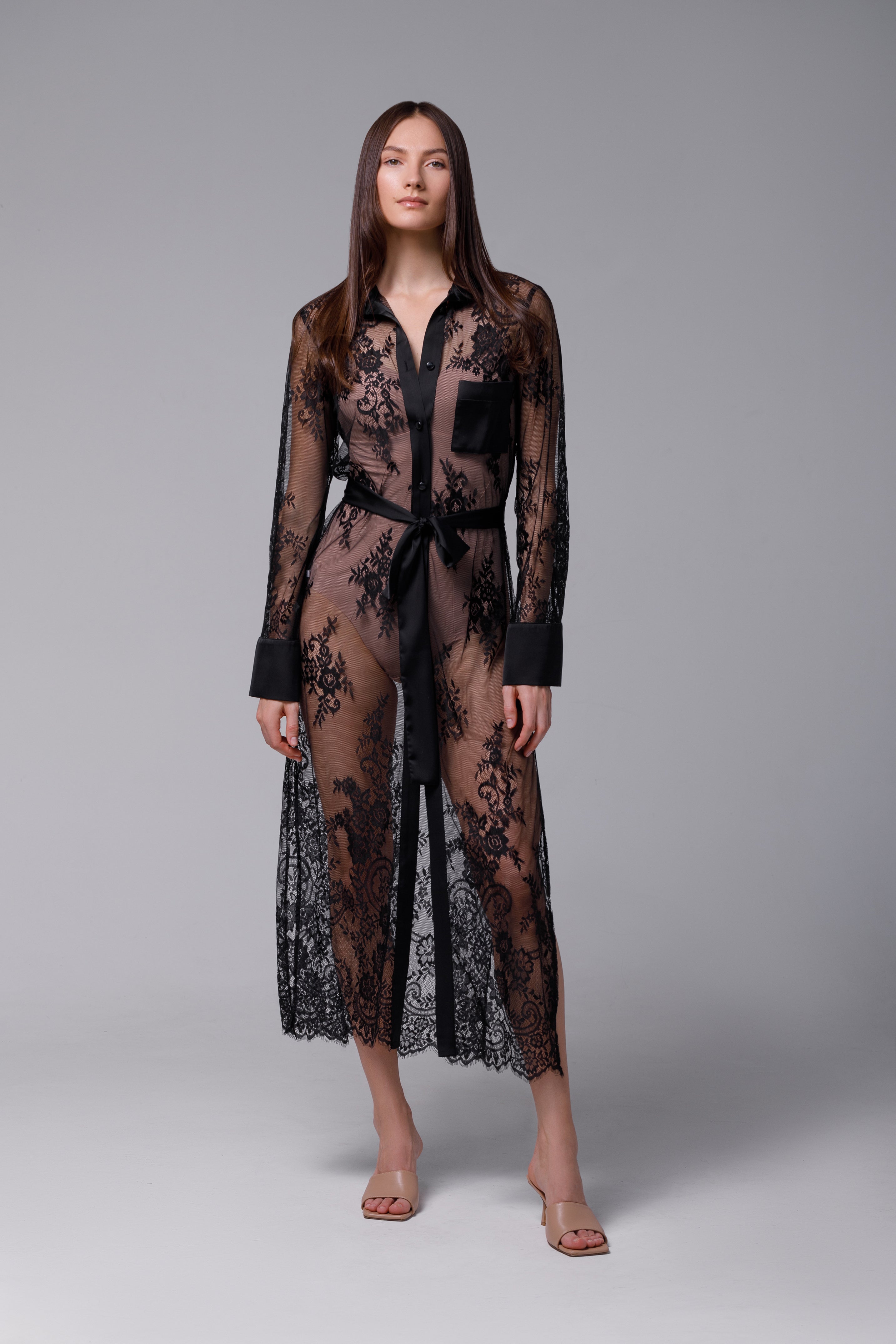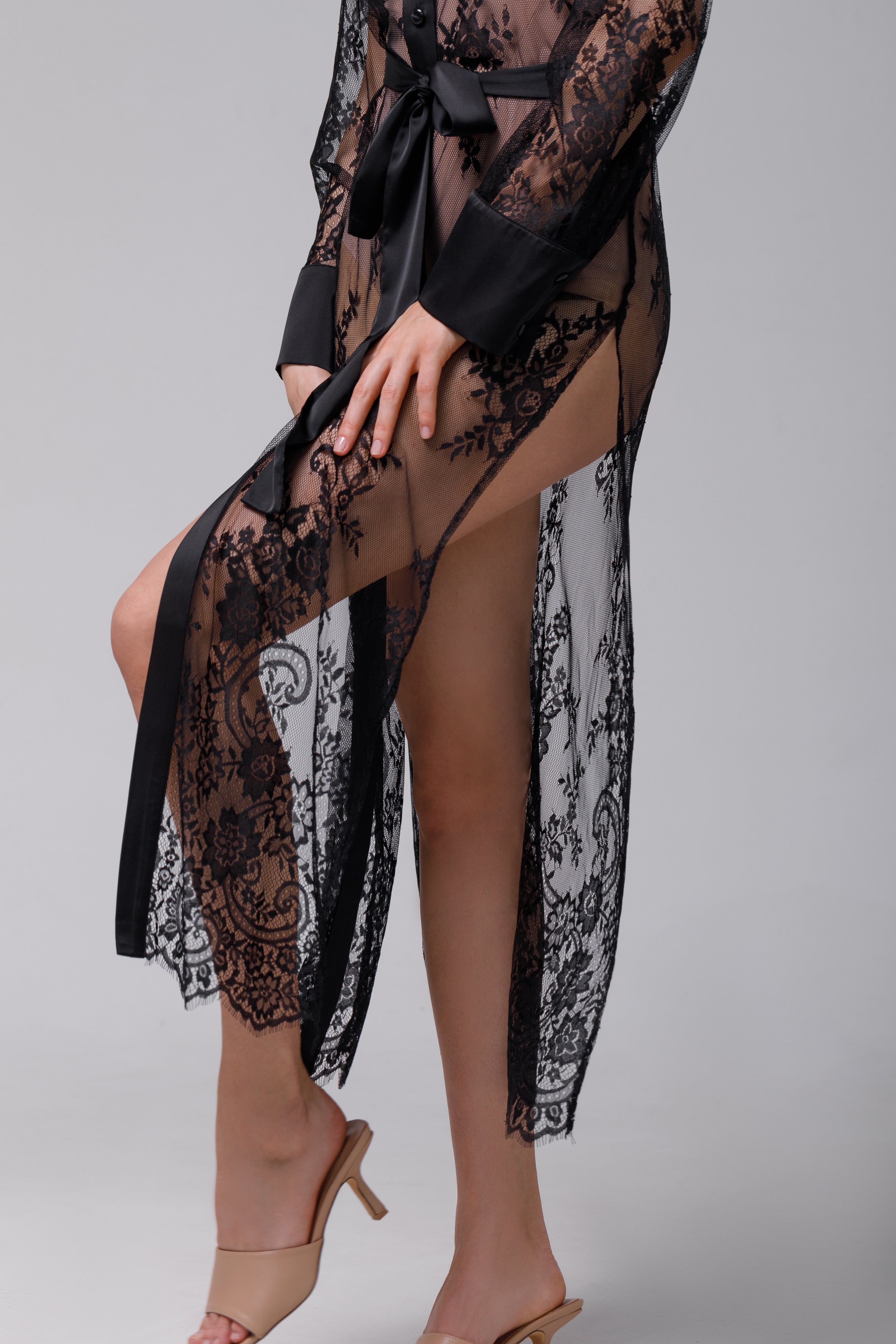 Discover elegance and sophistication in a exquisite shirtdress made from high-quality black lace with delicate satin trim. This gown combines the classic charm of lace with the subtle luxury of satin to create a truly remarkable piece of clothing
