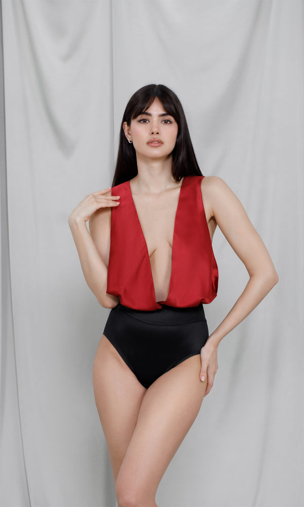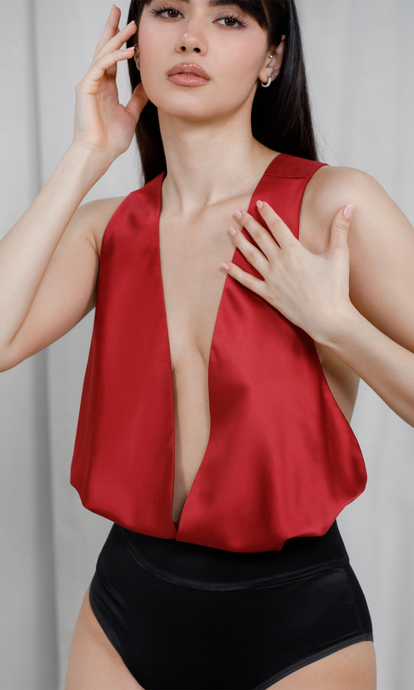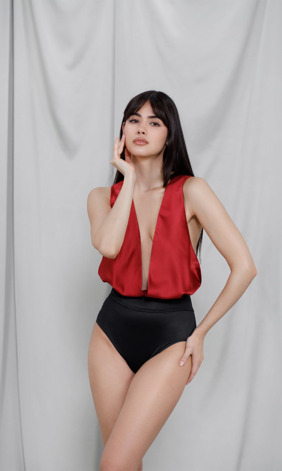 Body in burgundy color with a sophisticated and attractive design. It is made of satin, giving a luxurious and comfortable feel. The deep V-neckline accentuates the neckline and adds a daring touch to the outfit. Sleeveless, this bodysuit can be worn either with a pair of smart trousers for a special evening or with a skirt for a formal event or a night out. Details like the fluid drape of the material contribute to a chic and modern look