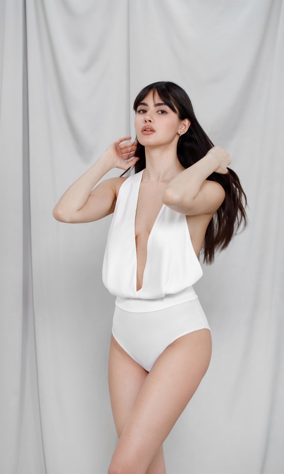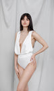 Discover our satin bodysuit, a luxurious choice for special moments. With its Ivory silk Ivory cups and stretch microfiber briefs, this bodysuit exudes elegance and sophistication. The modern plunging neckline and flirty back with twisted straps add a seductive touch to the whole ensemble. Perfect to be worn under a high-waisted blazer, this bodysuit is the ideal choice to emphasize your beauty and femininity in a subtle and sophisticated way