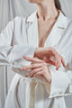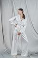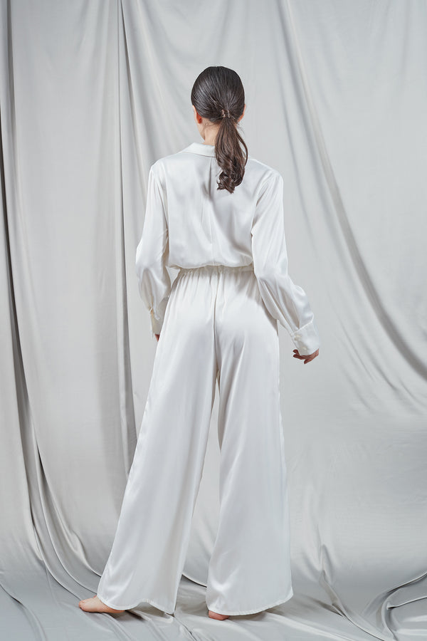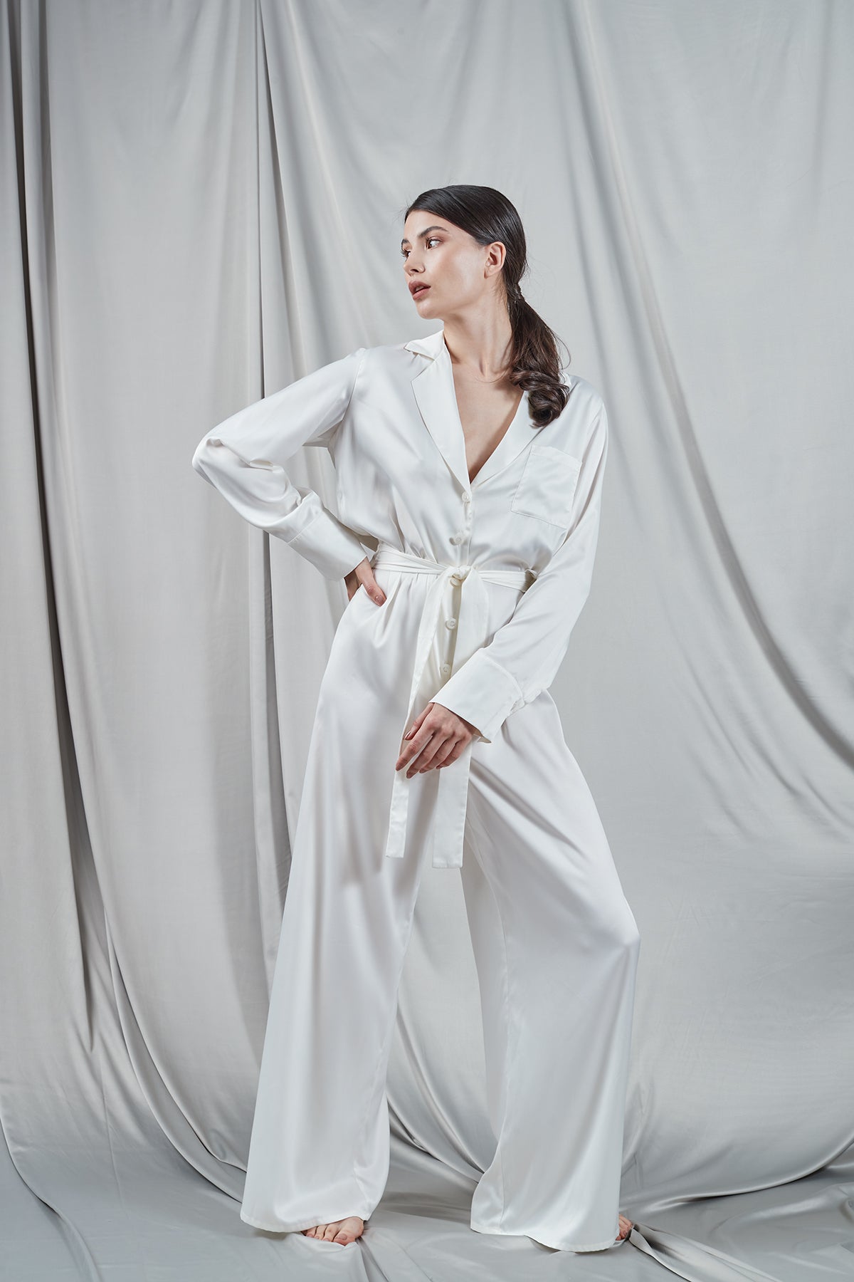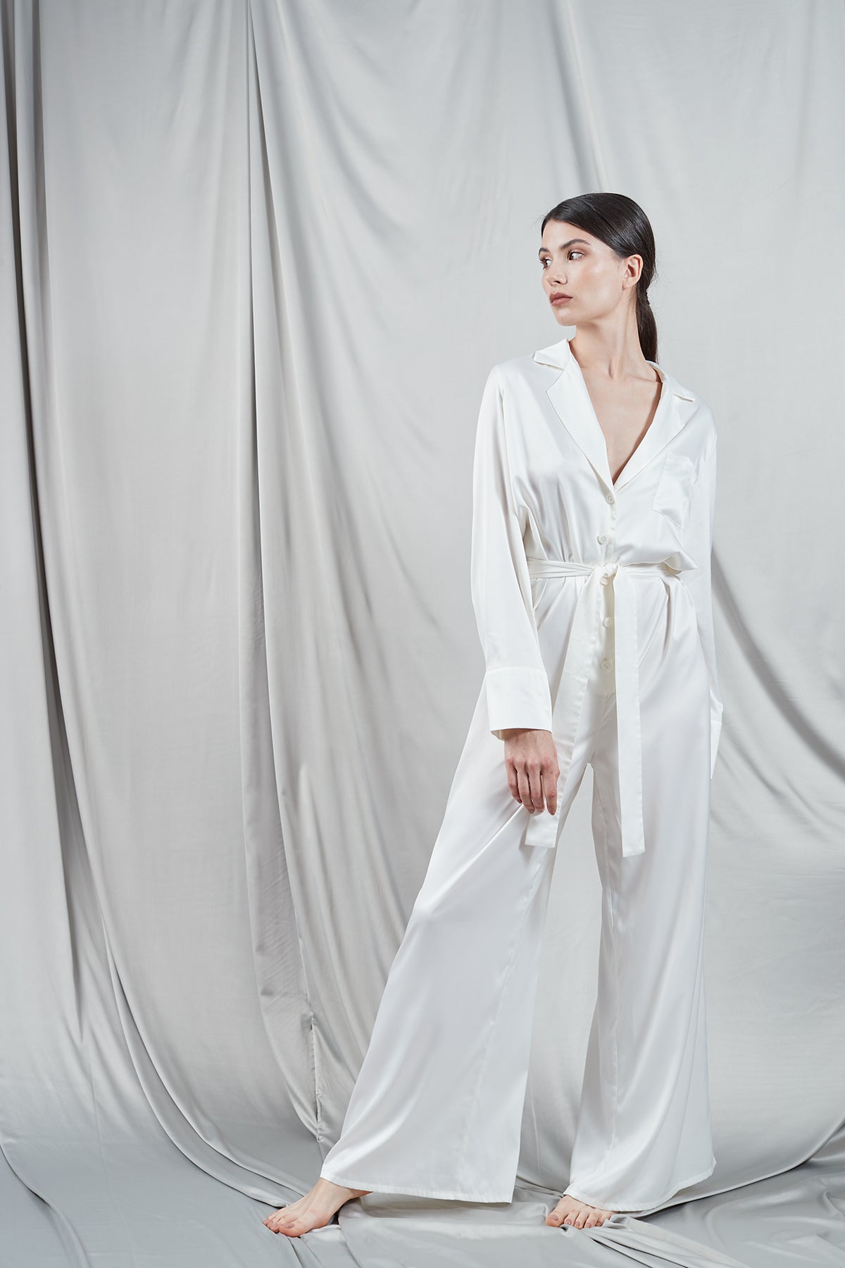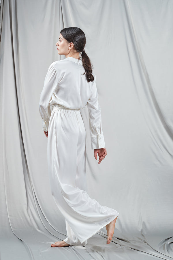 Versatile jumpsuit, a sophisticated ivory piece of clothing. It features a long-sleeved design with a V-neckline that adds a touch of femininity and sophistication. It is fastened at the front with tone-on-tone buttons that elegantly fade into the fabric. The waist is highlighted by a tied belt in the same material and color, which helps contour the silhouette. The pants are a loose palazzo style, giving the outfit a contemporary look and relaxed allure. Crafted from silk with a fluid drape, this ivory jumpsuit is a stylish choice for formal events or smart-casual.