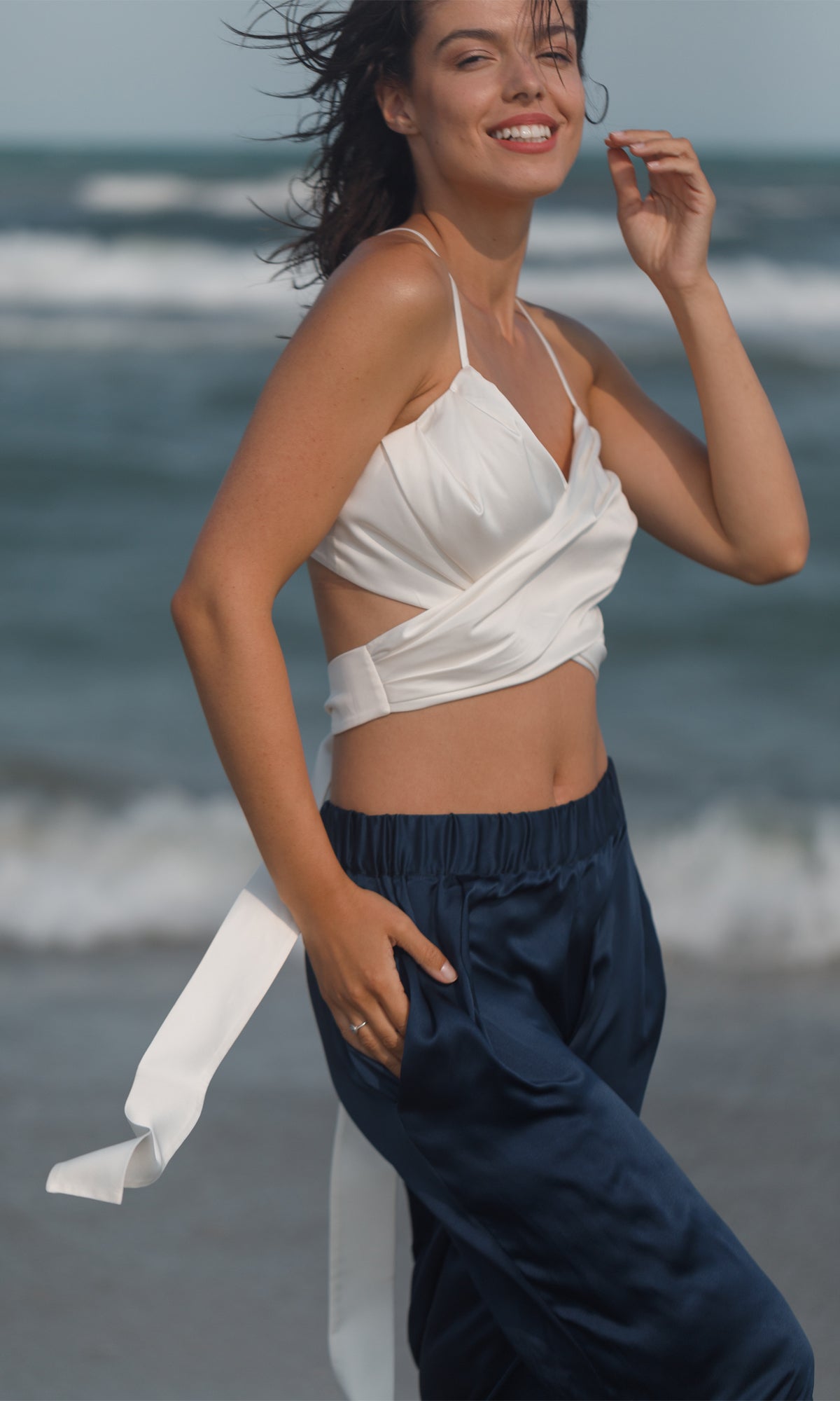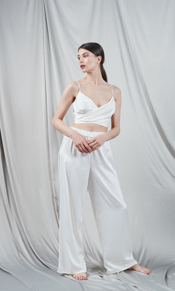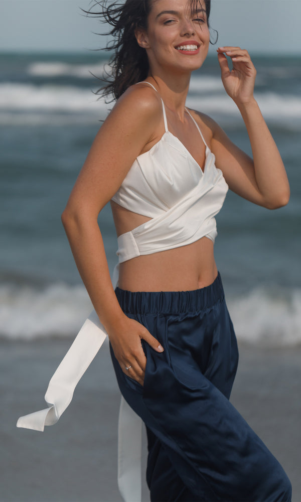 Ivory top, defined by its elegant and feminine simplicity. It is made of satin which emphasizes the delicacy and softness of the fabric, giving it a high quality look. With a deep V-neckline and slim straps, the top gracefully sculpts the neckline and shoulders. Its wrap design creates an interesting versatile effect, adding texture and dimension. The top fits loosely on the body, allowing for unrestricted movement and maximum comfort, making it an ideal piece for summer outfits or formal events where a chic look is desirable