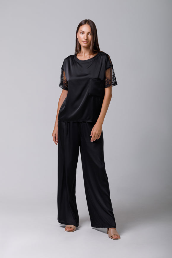 Black satin T-shirt with lace