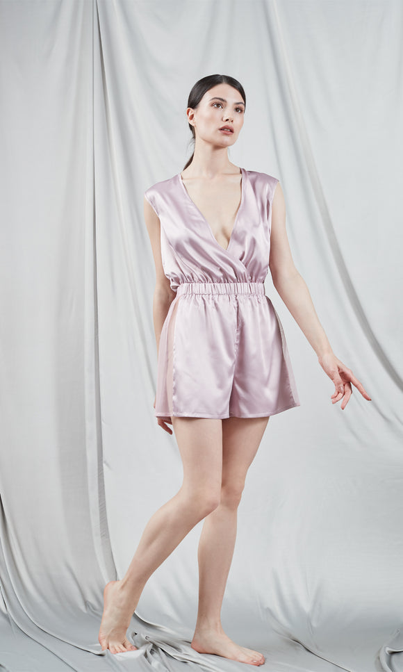 Pale pink silk overalls with lace