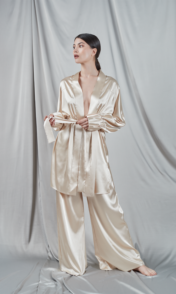 Short champagne satin kimono