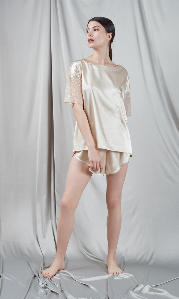 Champagne satin T-shirt with lace