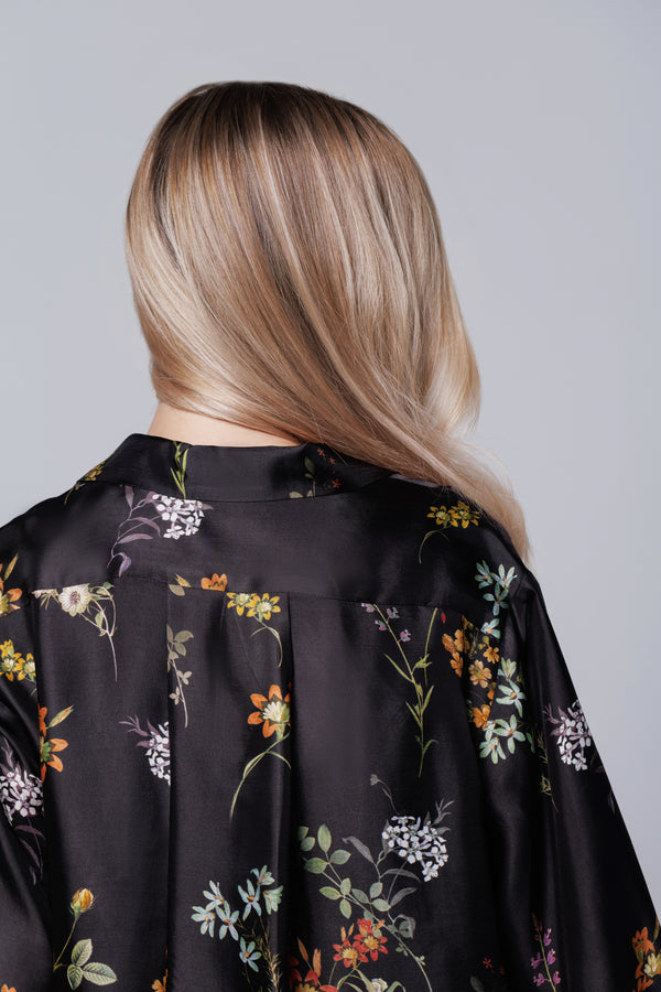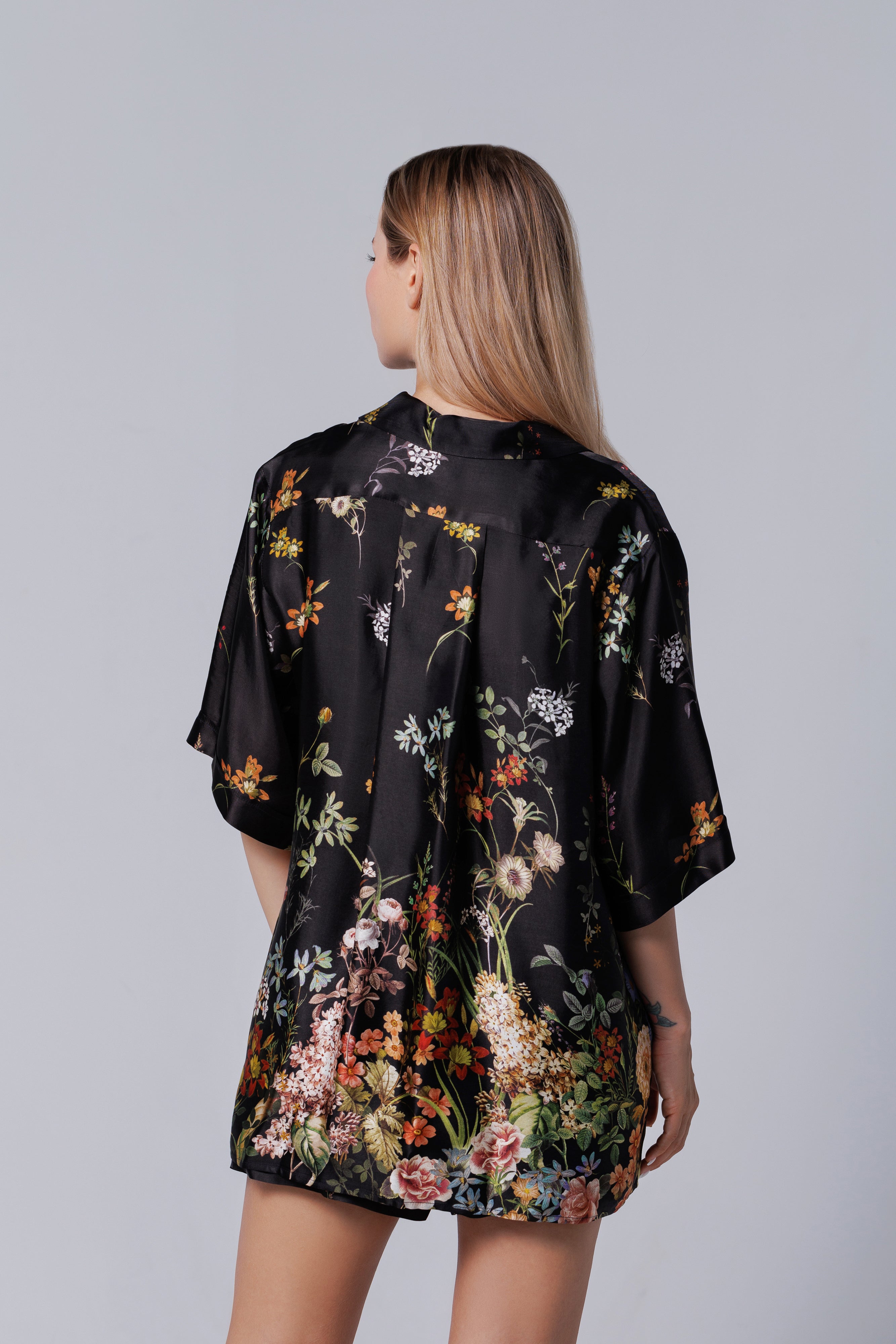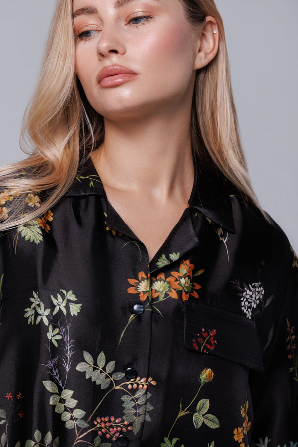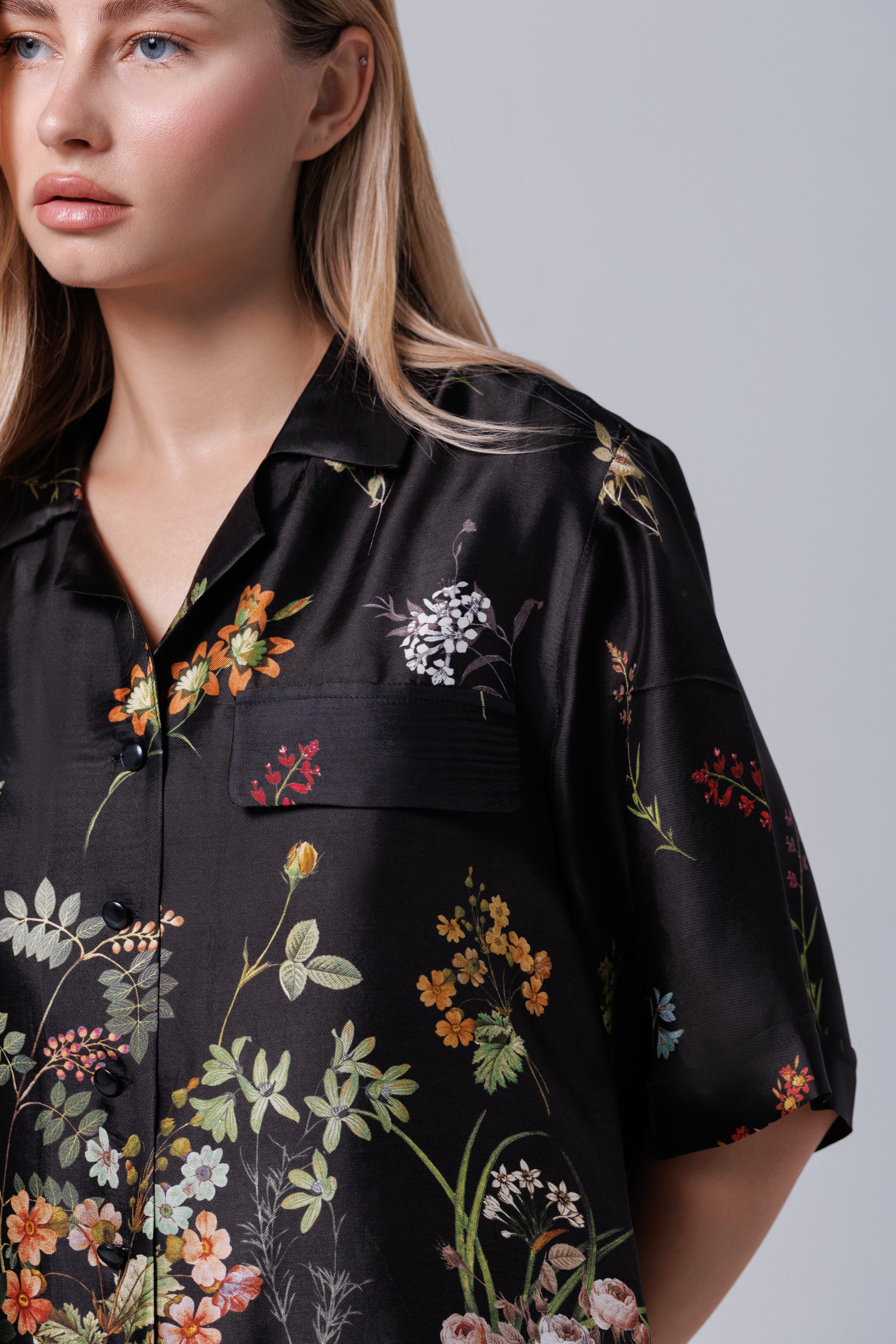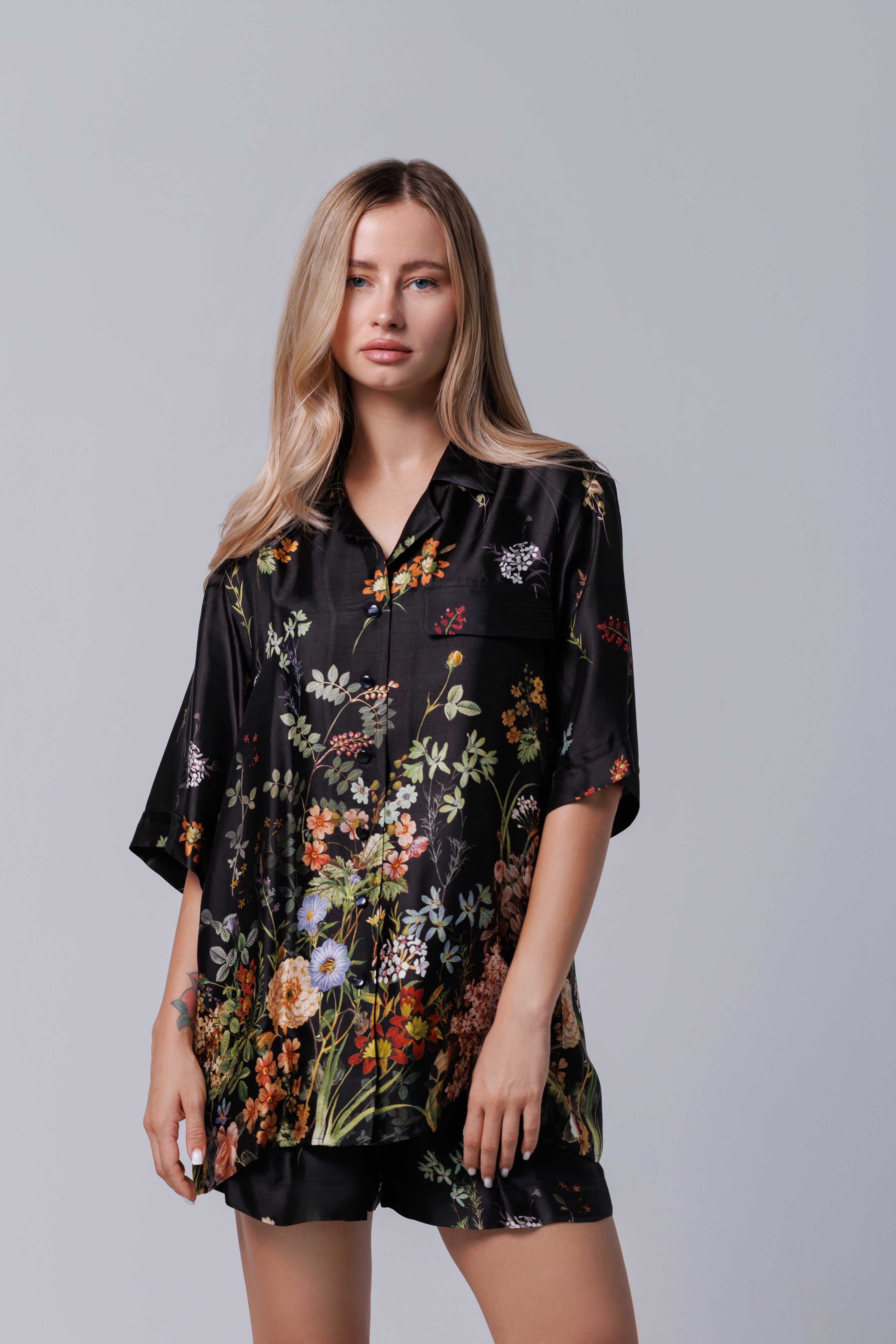 Stylish and lightweight, this oversized shirt in 100% viscose is made from 100% viscose and features a rich floral print on a black background. The relaxed cut with short sleeves and patch pocket offers freedom of movement and a modern look. Perfect for both casual daywear and sophisticated evening combinations
