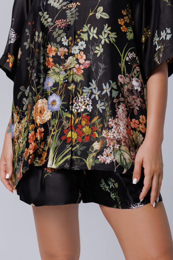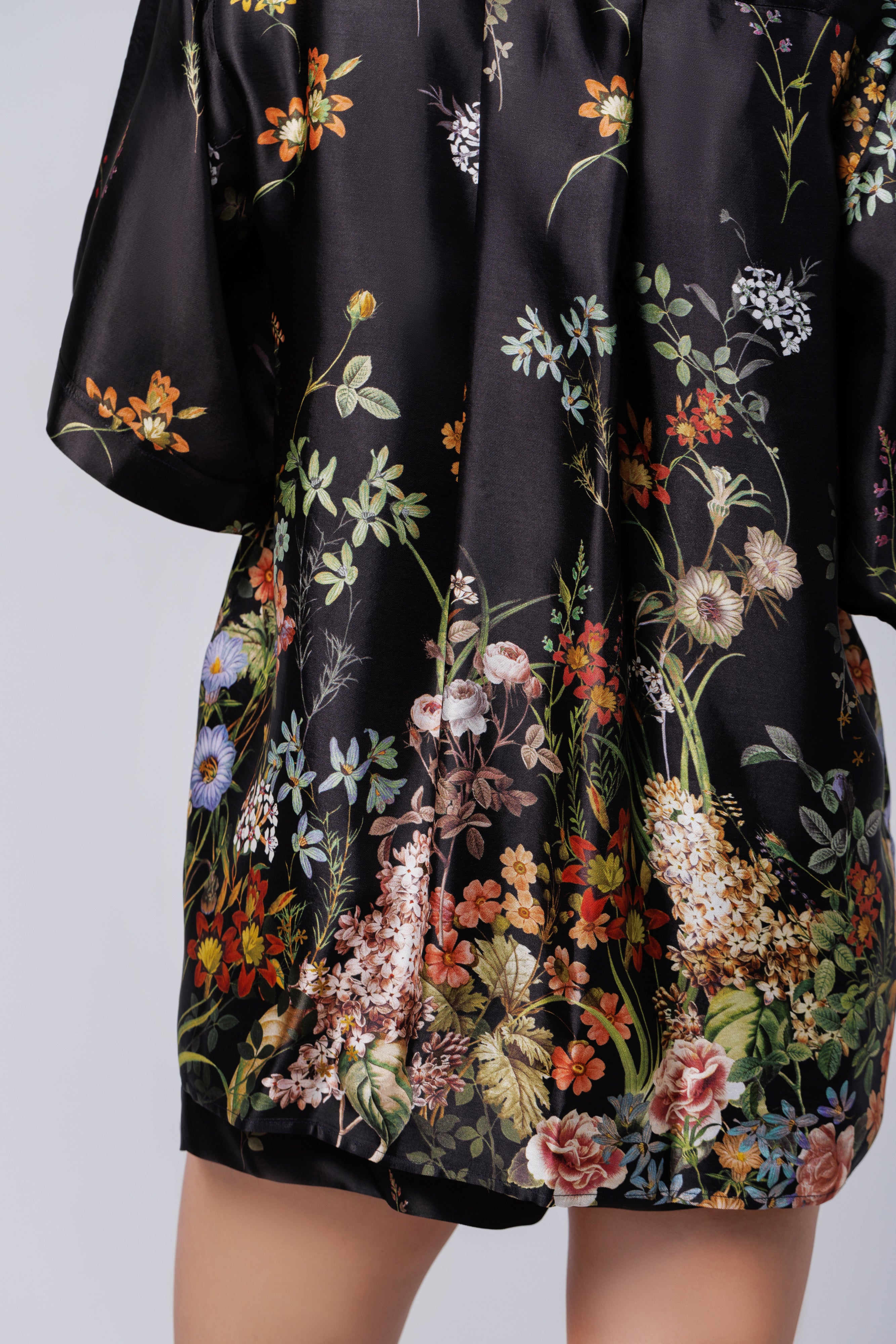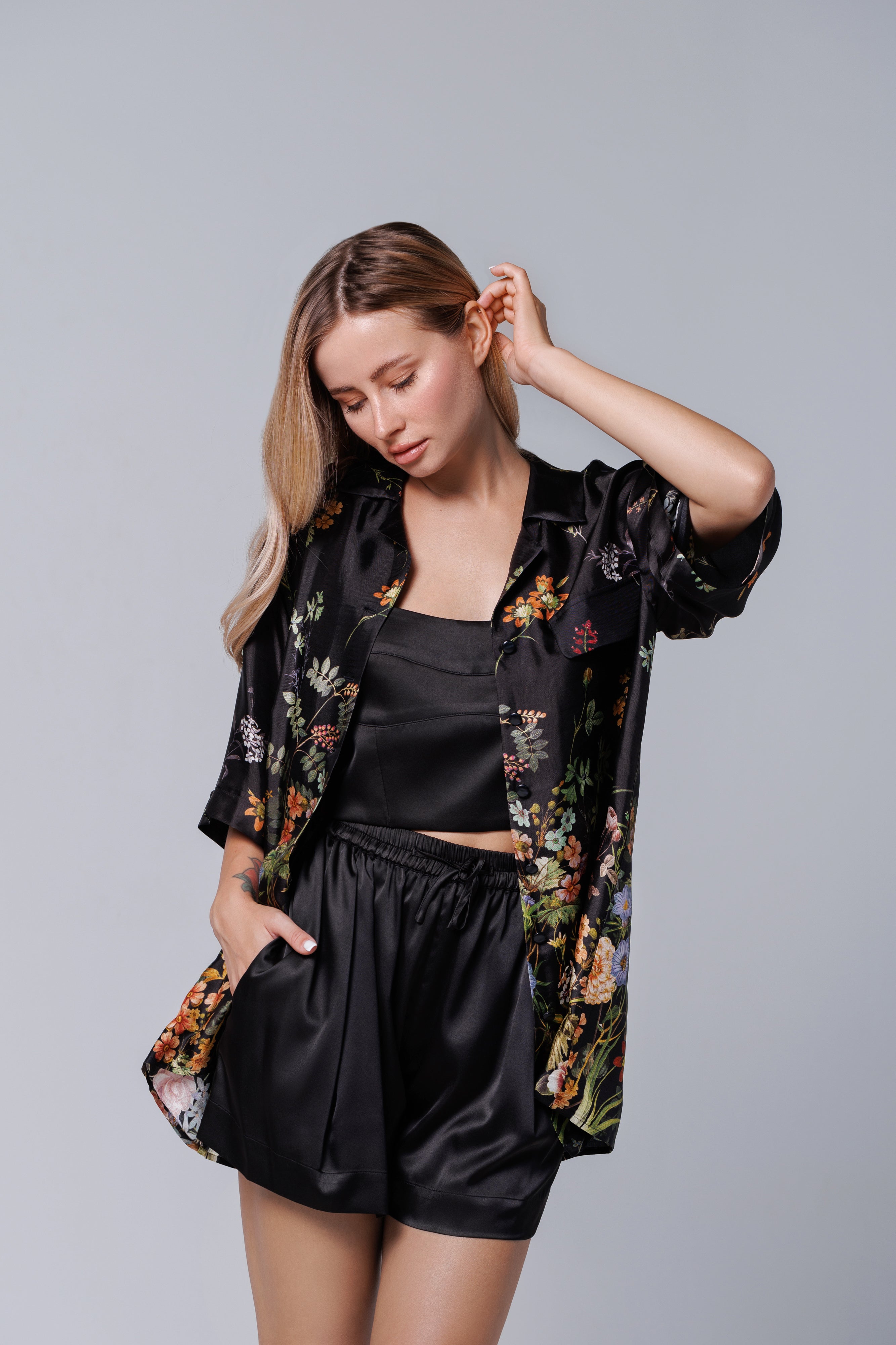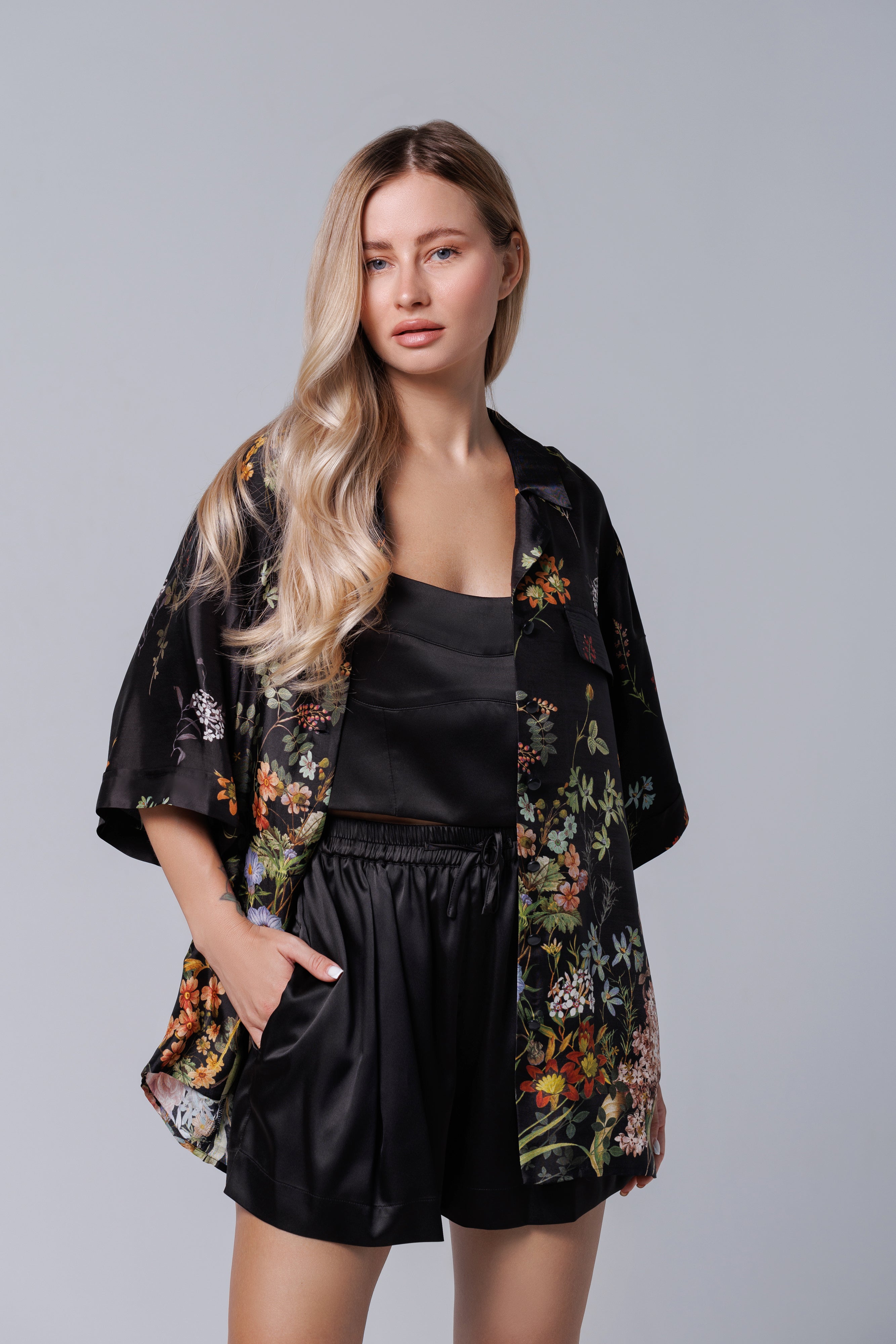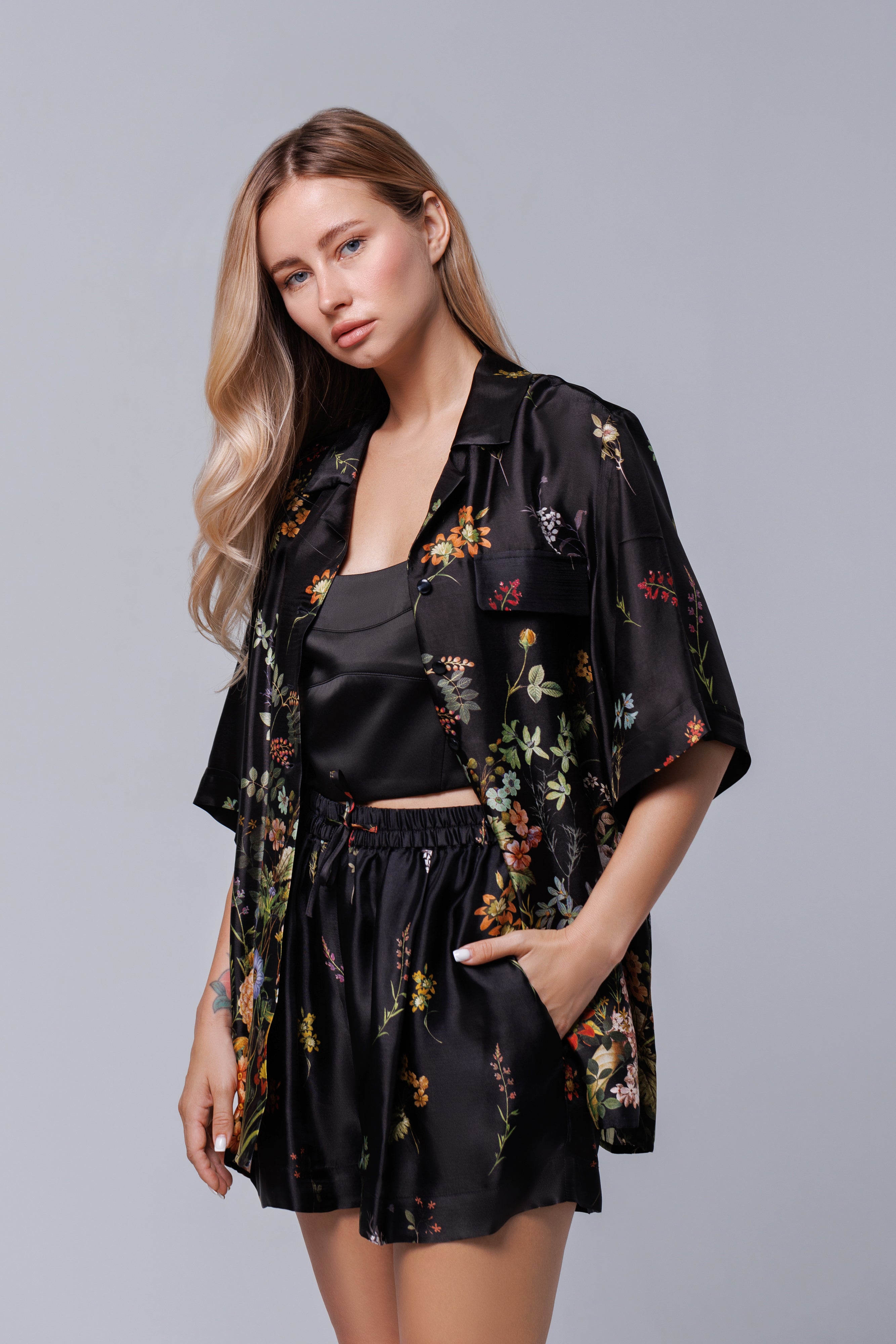Stylish and lightweight, this oversized shirt in 100% viscose is made from 100% viscose and features a rich floral print on a black background. The relaxed cut with short sleeves and patch pocket offers freedom of movement and a modern look. Perfect for both casual daywear and sophisticated evening combinations