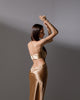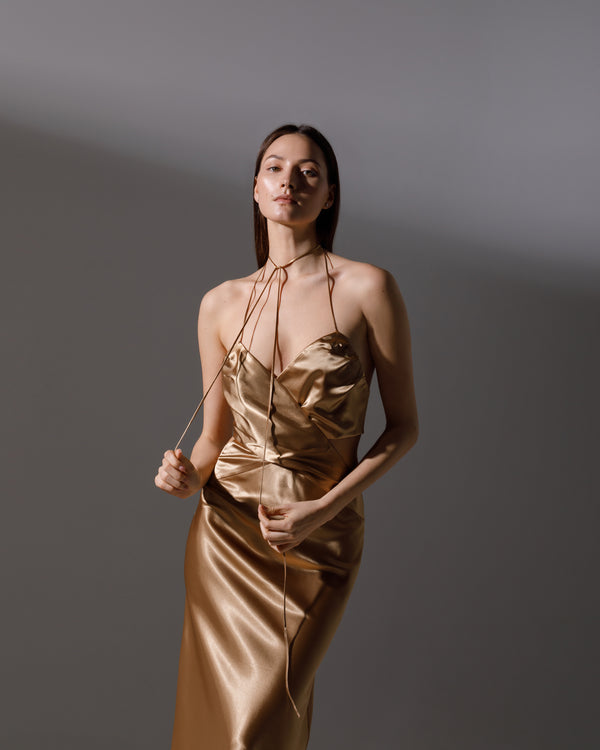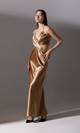 The champagne-toned long gala dress is a masterpiece of craftsmanship and style, creating a silhouette that highlights and celebrates the feminine form. The high-quality satin content gives it a lustrous sheen and fluid drape, while strategic cutouts at the waist and a deeply nude back add an air of sensuality. The slim, adjustable straps allow for a perfect fit to your body shape, and the deep V-neckline gracefully complements the neckline. Whether worn for an evening event or as a daring choice for a wedding, this dress is destined to catch the eye and stay in the memory