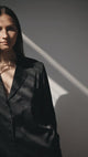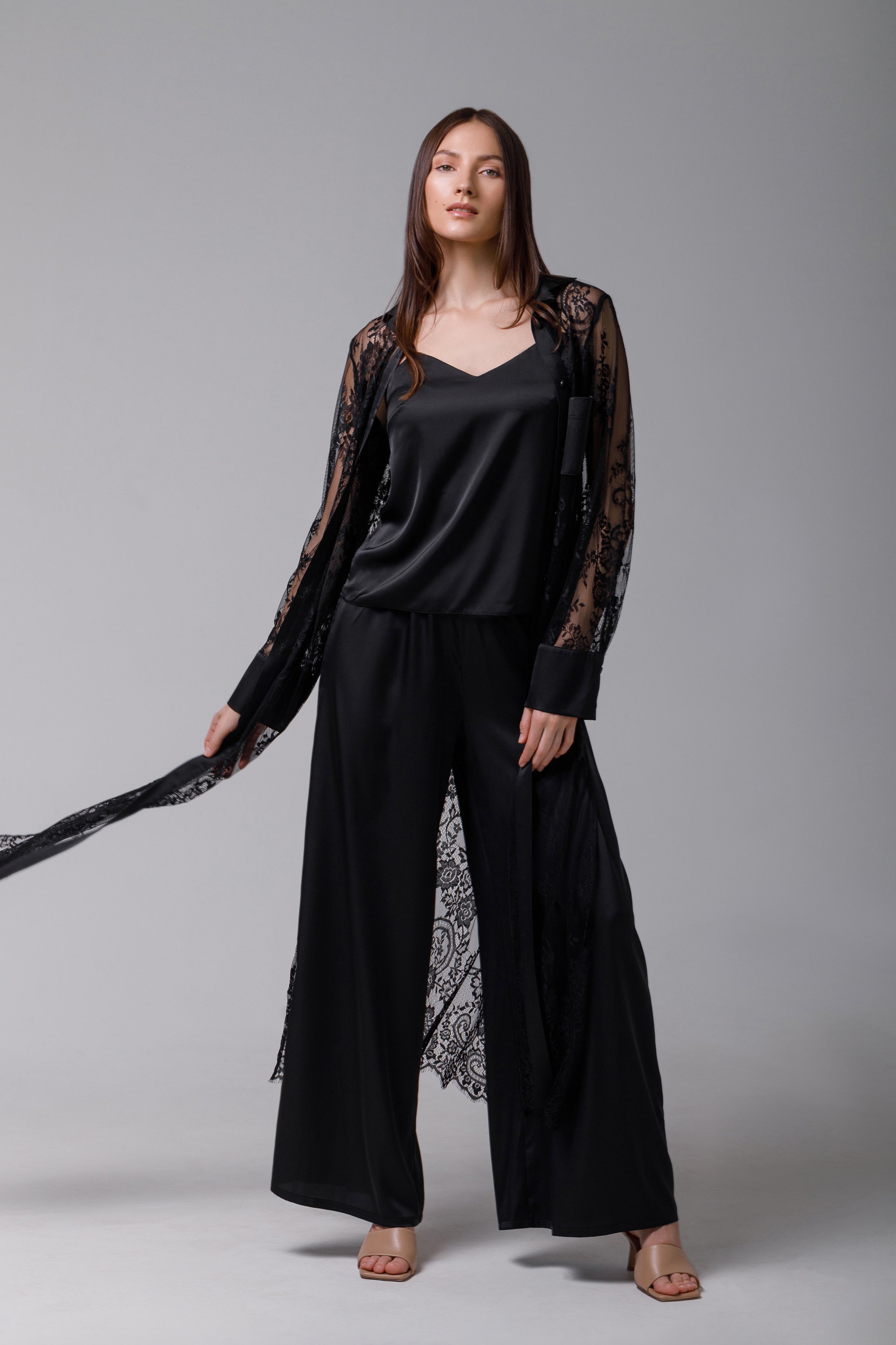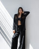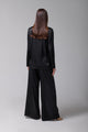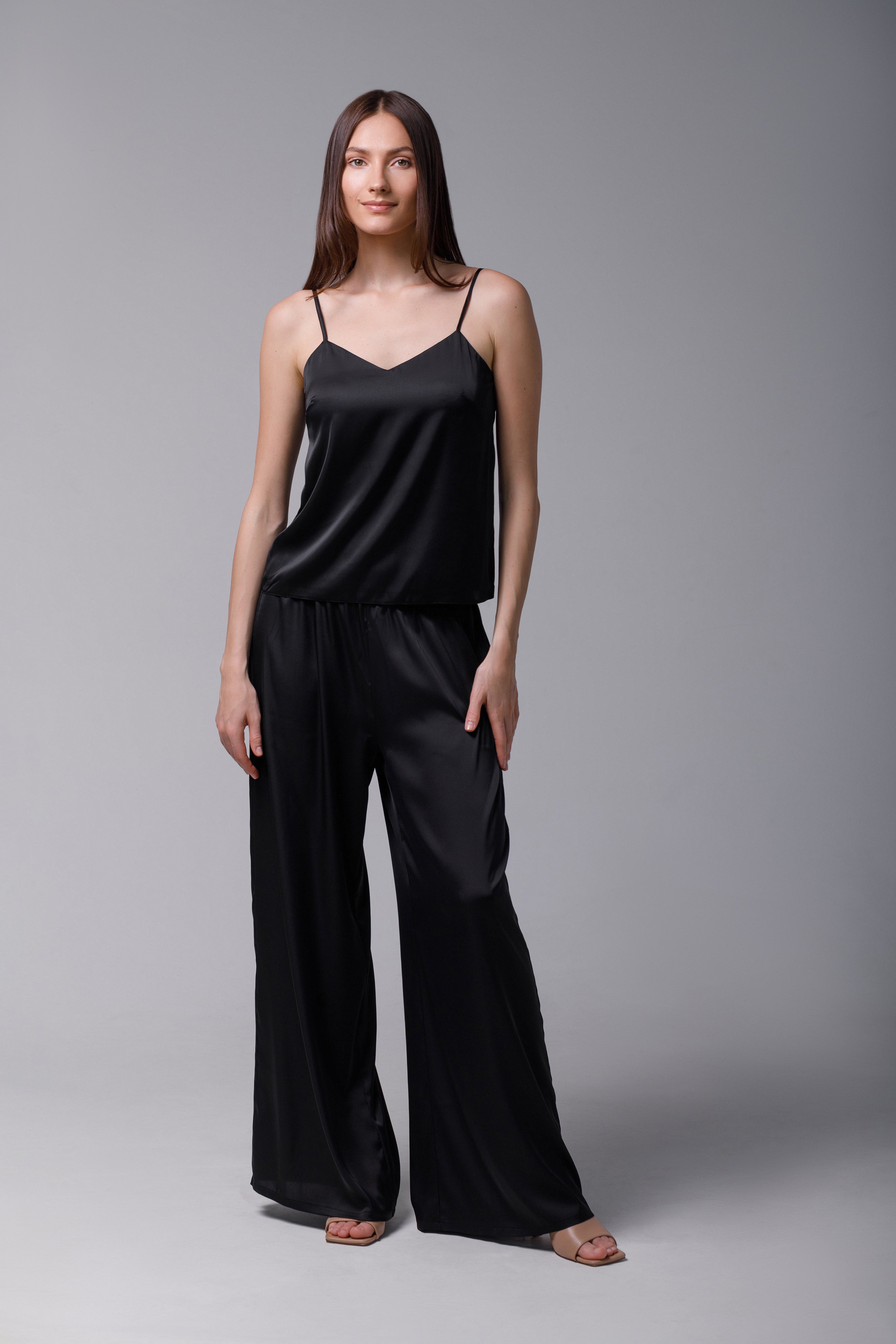 The exquisitely elegant palazzo pants are crafted from high-quality satin in a deep shade of black. Their loose-fit design offers a modern and sophisticated silhouette. The high, elasticized waist ensures both comfort and an effortless fit, ideal for all-day wear or special events. The fluid silk falls beautifully down the legs, creating graceful movement and a luxurious look. These pants can be worn as part of a coordinated ensemble with a silk top or as the focal point of an outfit with a simple blouse, adding a touch of opulence to any look