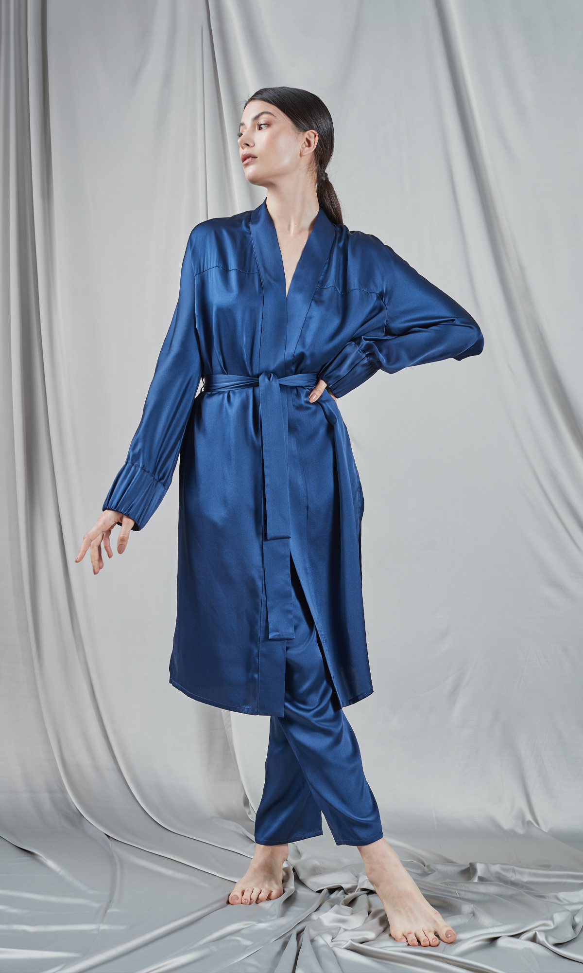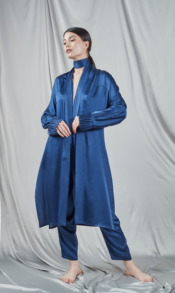 Kimono in a beautiful shade of navy blue, a paragon of elegance and comfort. It's made from lustrous silk, which gives it a luxurious look and a fluid drape. The simple, clean-lined design is embellished with a high collar that adds contemporary detail. The long sleeves are finished with elastic cuffs, bringing a subtle contrast of shape and texture. The kimono is open at the front and can be cinched at the waist with a matching drawstring, allowing for adjustment to suit your preference. The piece can be worn in a variety of contexts, whether as an extra layer of elegance over an evening outfit or as the main piece in a relaxed outfit at home