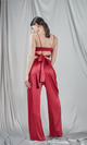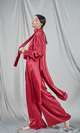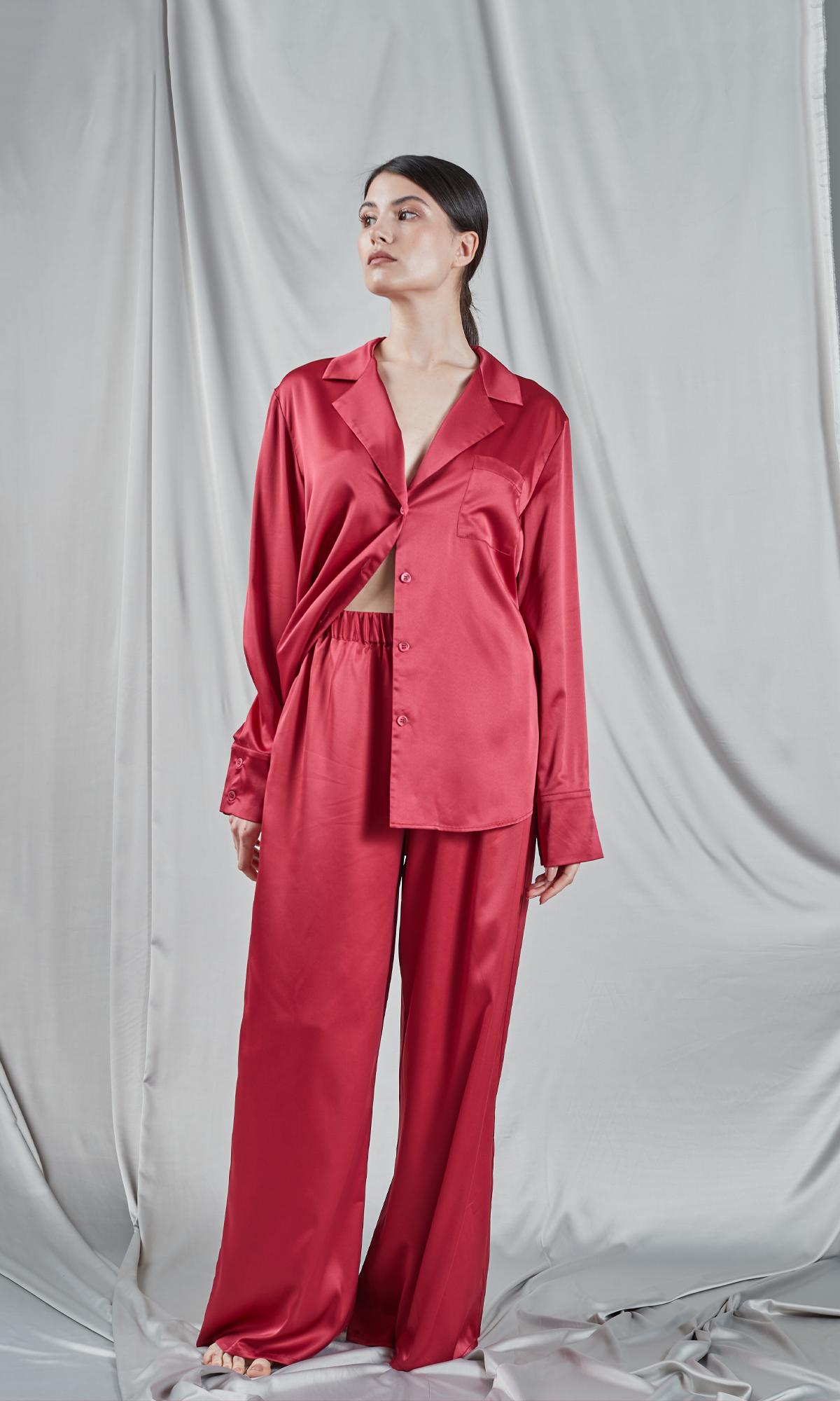 Loose-fitting pants in a palazzo design made from rich red satin. They have a fluid fall, giving a comfortable and elegant feel. The waist of the pants is high, helping to elongate the silhouette, and the generous cut offers graceful movement with every step. The silk fabric emphasizes luxury and sophistication, making these trousers suitable for special occasions or as part of a luxurious loungewear outfit