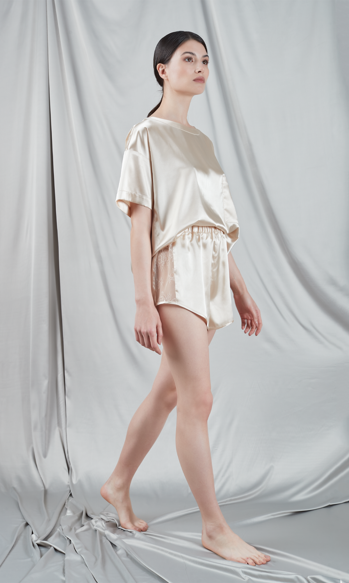 Pants crafted from fine champagne-colored satin offer a luxurious and comfortable look. The design features an elasticized waistband for a secure and comfortable fit, while lace detailing appliqued on the sides adds a touch of femininity and sophistication. The cropped length and loose fit contribute to an airy, relaxed silhouette, making these pants perfect for wearing at home or as a sophisticated loungewear piece. The satin finish emphasizes the brand's premium quality and neat aesthetic.