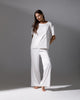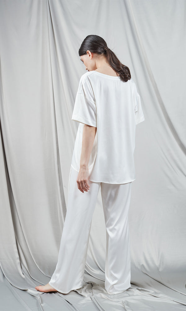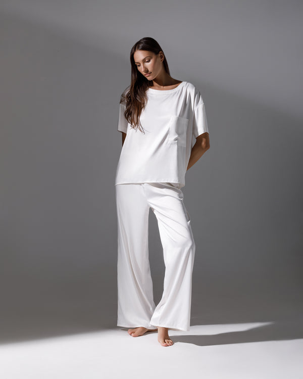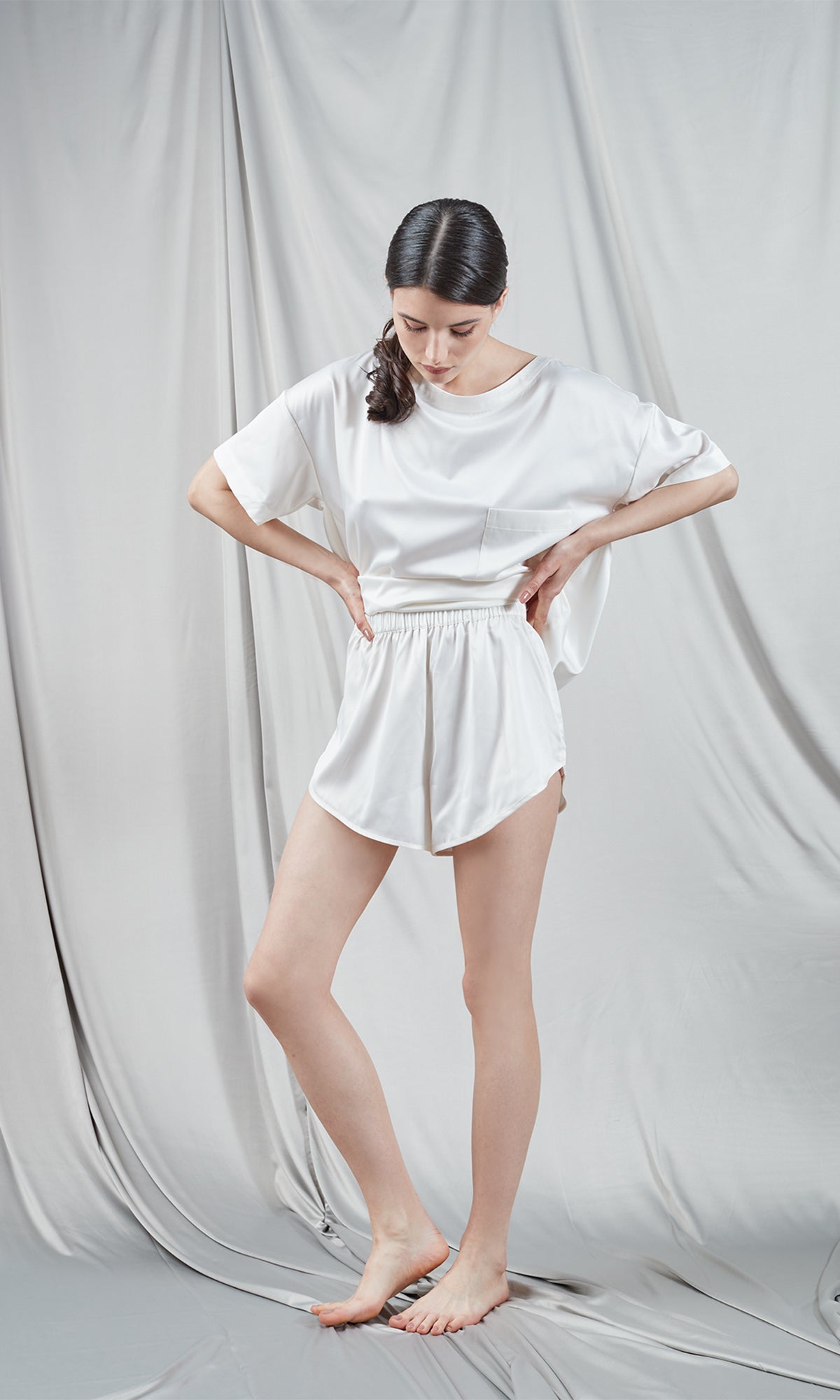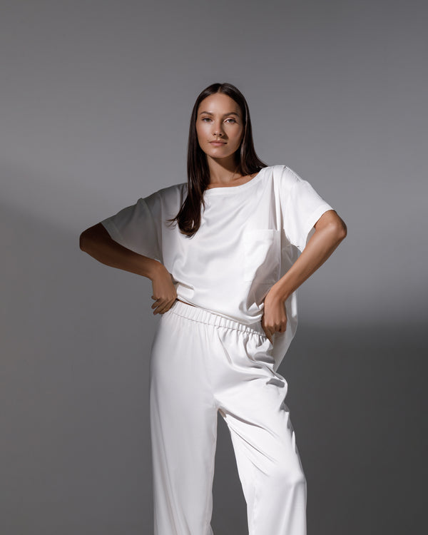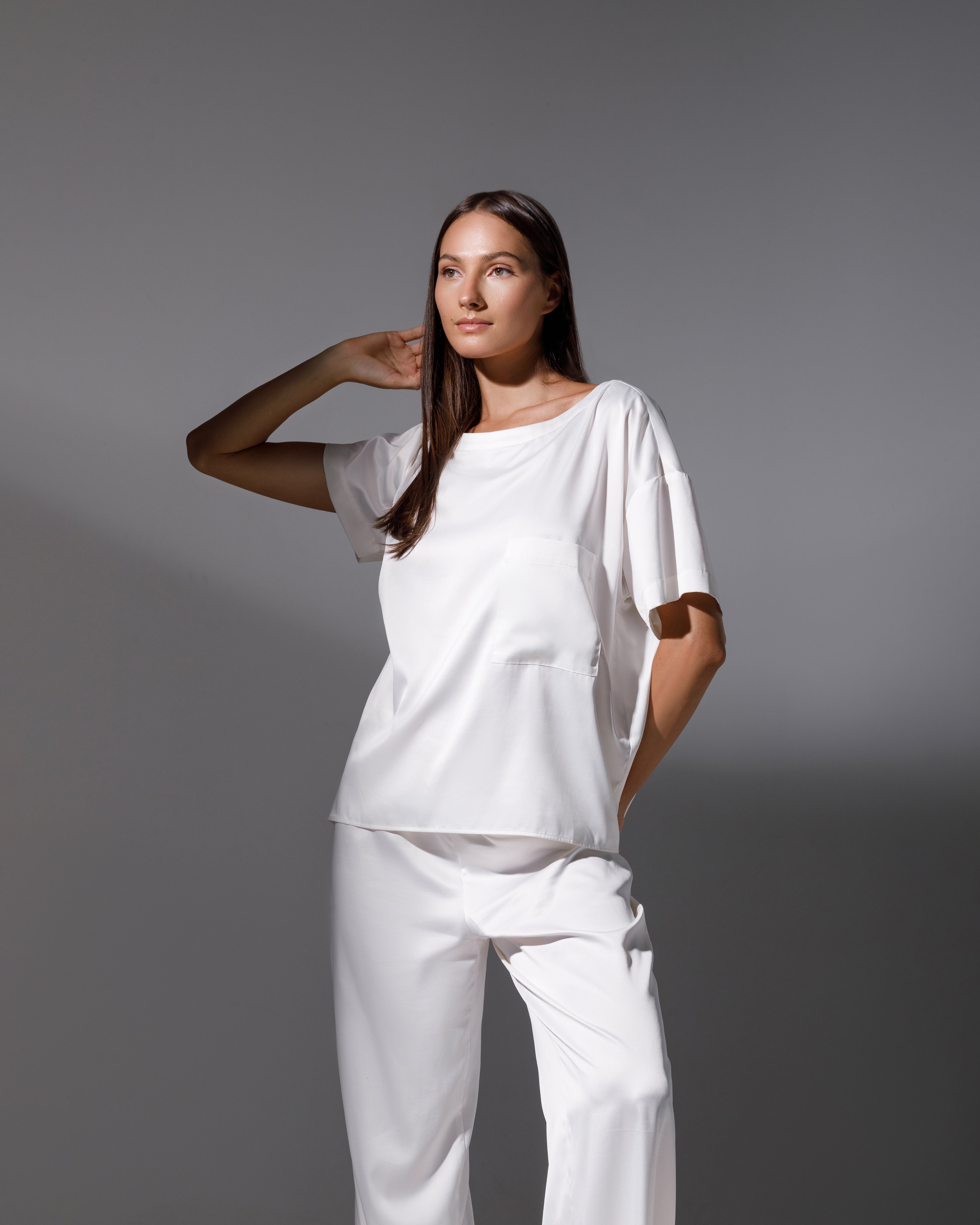 Elegant shirt made of ivory-colored satin, giving it a fine texture and a luxurious look. It has a simple design with a wide round collar and short sleeves. The loose fit and patch chest pocket add a casual detail to this casual garment. This shirt can easily blend into a relaxed outfit or can be paired with more sophisticated pieces for a modern and versatile look. The smooth and shiny silk finish emphasizes the premium quality of the shirt