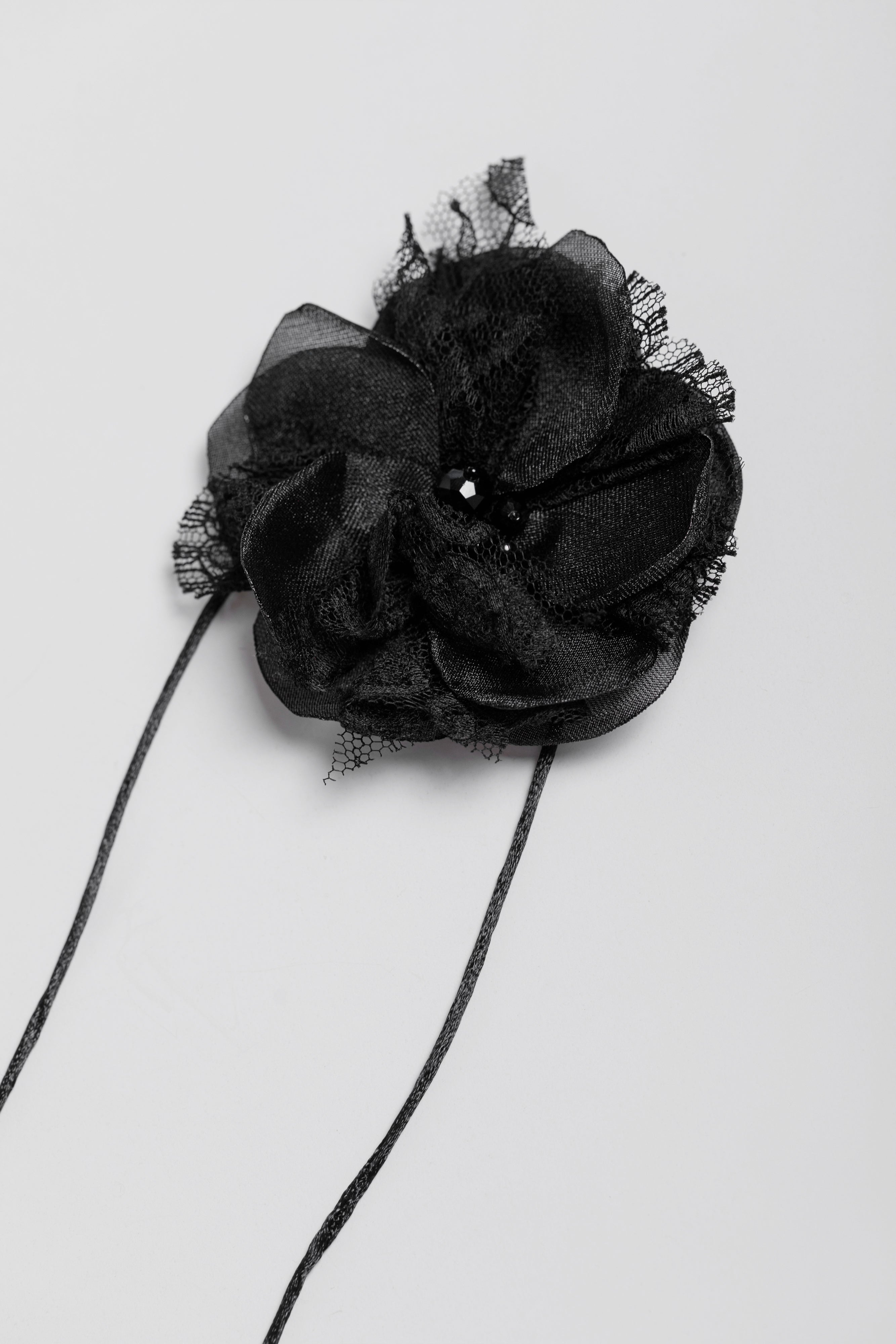 Discover our black flower choker, a delicate and charming accessory that will add an elegant and bohemian touch to any outfit. This choker is decorated with lace and organza roses in a deep shade of black, giving it a captivating and romantic look.