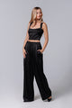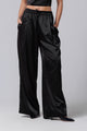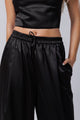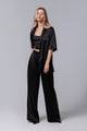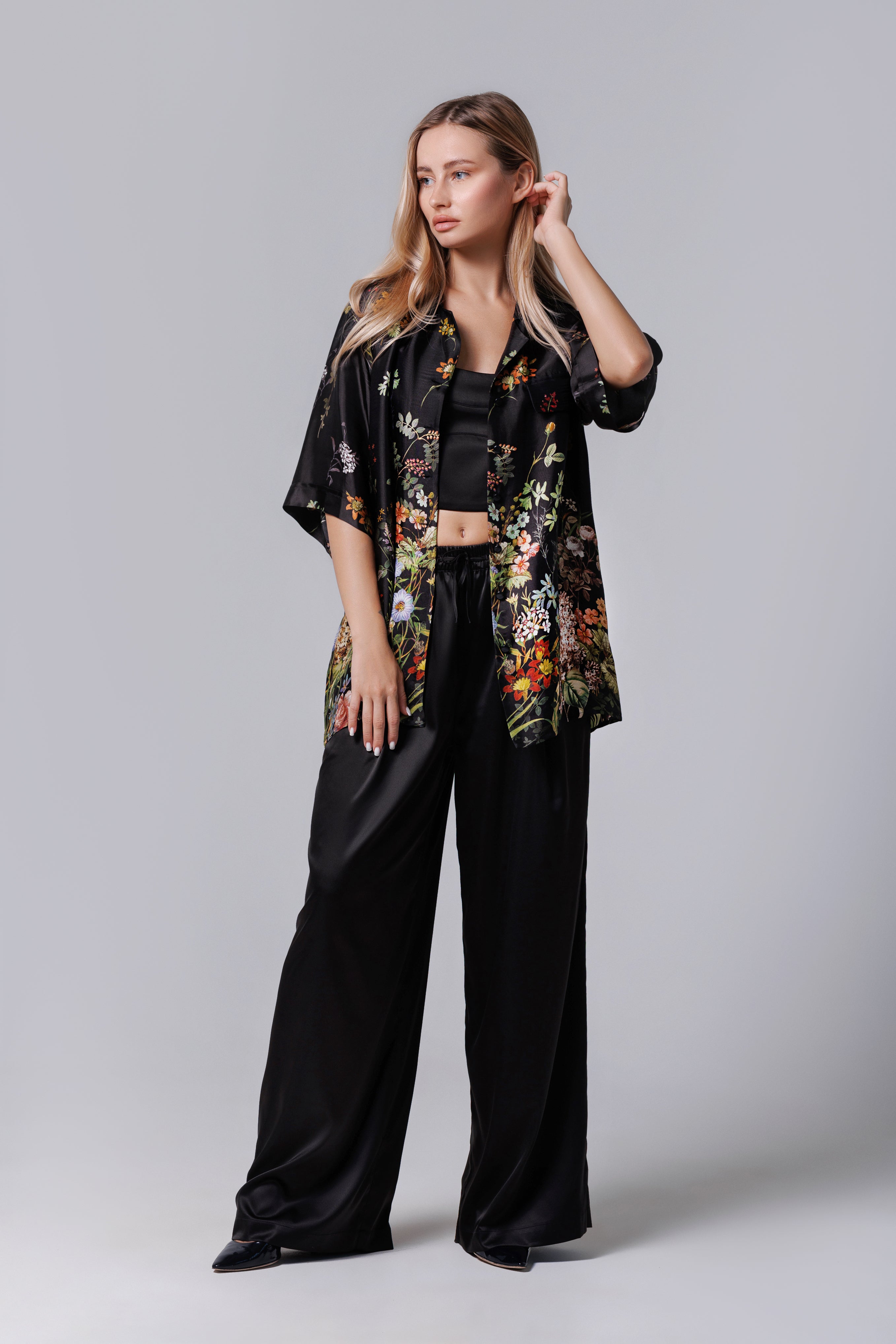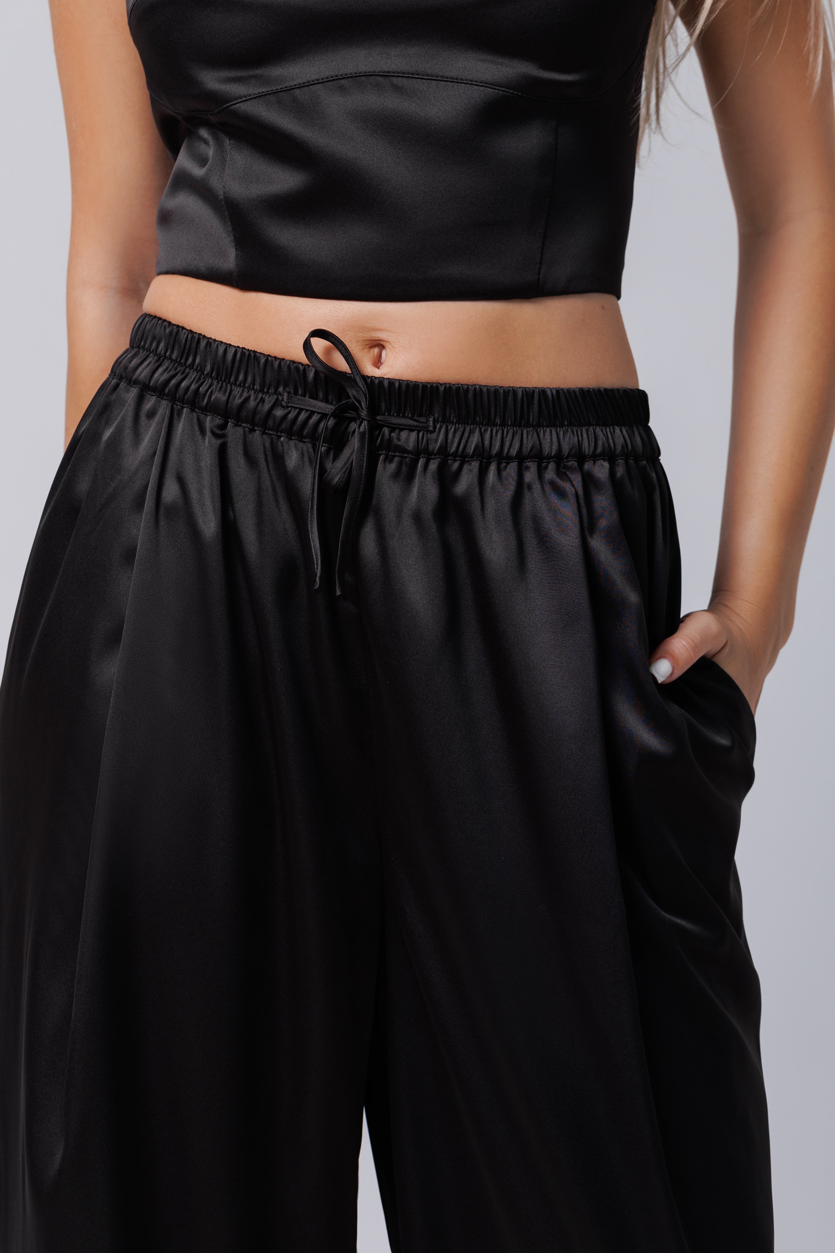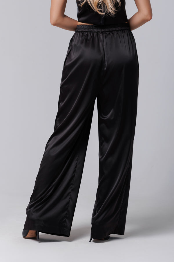 The exquisitely elegant classic trousers are made from high quality satin in a deep shade of black. Their design offers a modern and sophisticated silhouette. The high, elasticized waist ensures both comfort and an effortless fit, ideal for all-day wear or special events. The fluid silk falls beautifully down the legs, creating graceful movement and a luxurious look. These pants can be worn as part of a coordinated ensemble with a silk top or as the focal point of an outfit with a simple blouse, adding a touch of opulence to any look