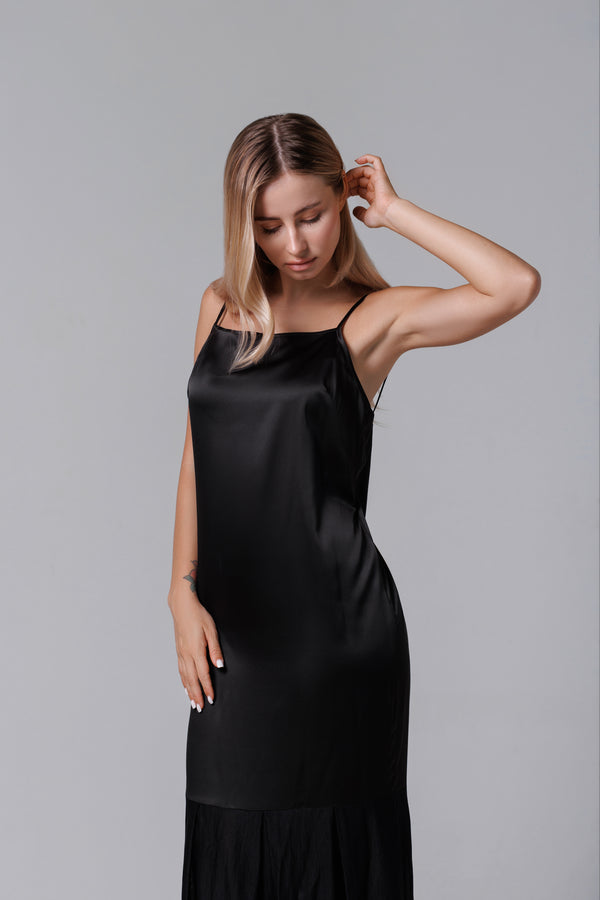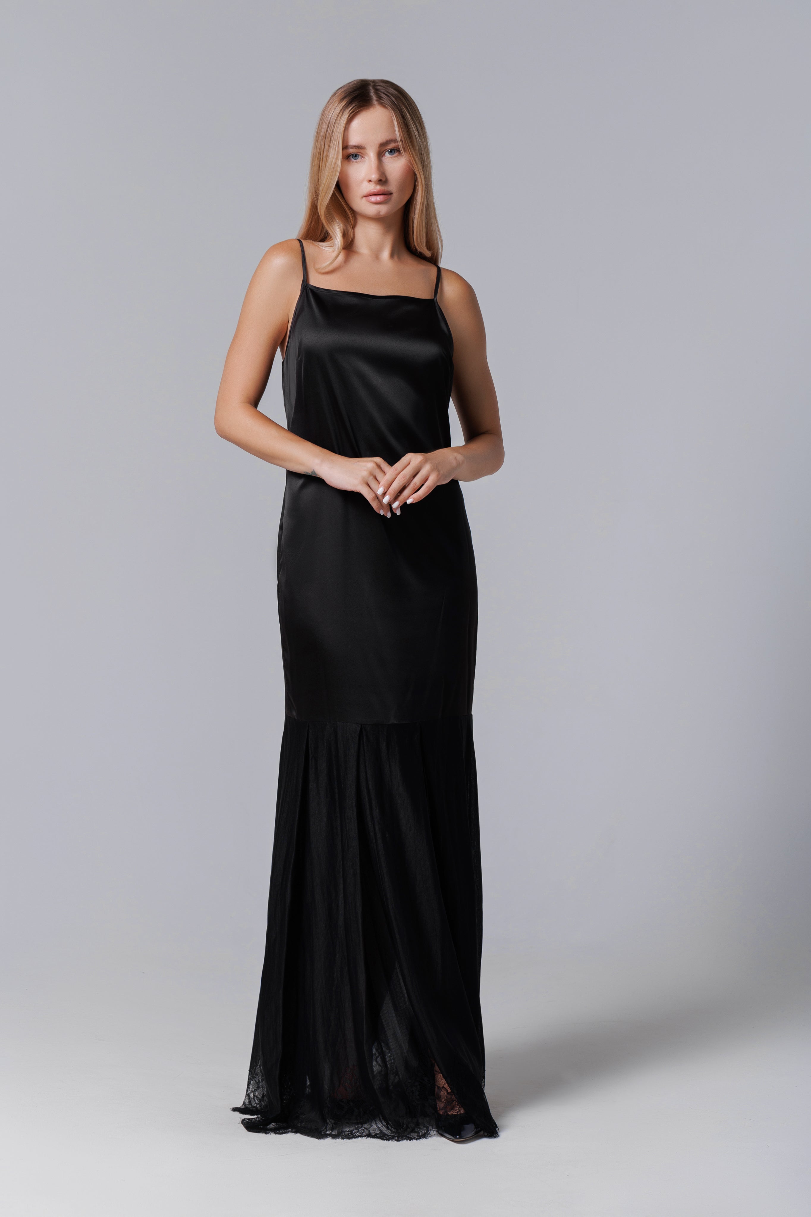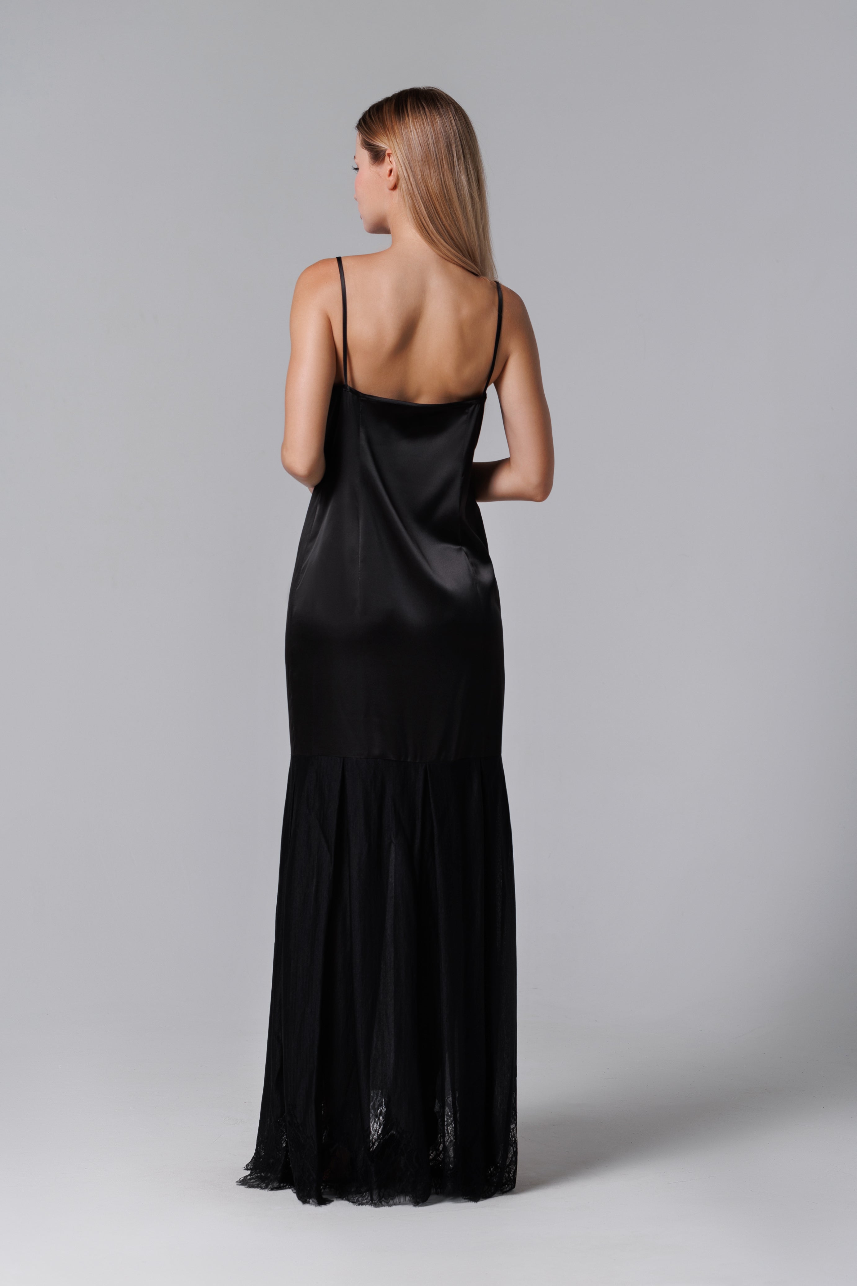Eine elegante Kreation mit fließenden Linien und exquisiten Details - dieses lange Kleid kombiniert die Weichheit von Satin mit der Zartheit von französischer Spitze. Die schmalen Träger und der minimalistische Schnitt wirken modern und sinnlich, während der untere Teil des Kleides aus Spitze eine romantische und raffinierte Note verleiht. Ideal für Gala-Abende, elegante Partys oder besondere Anlässe, das Kleid verspricht, die Blicke auf sich zu ziehen.