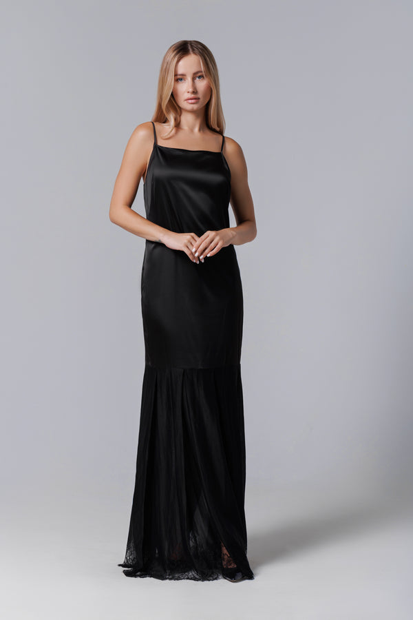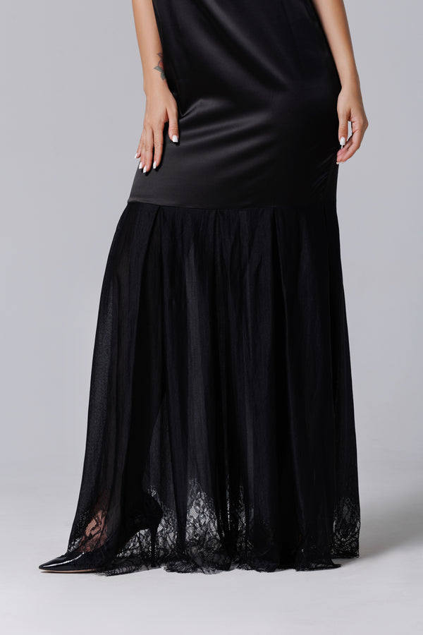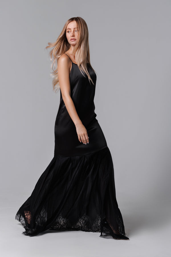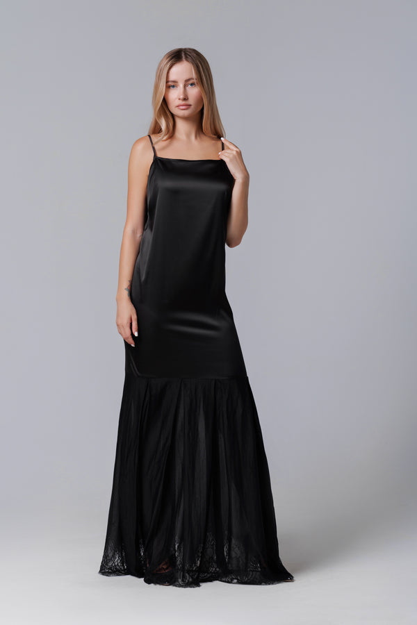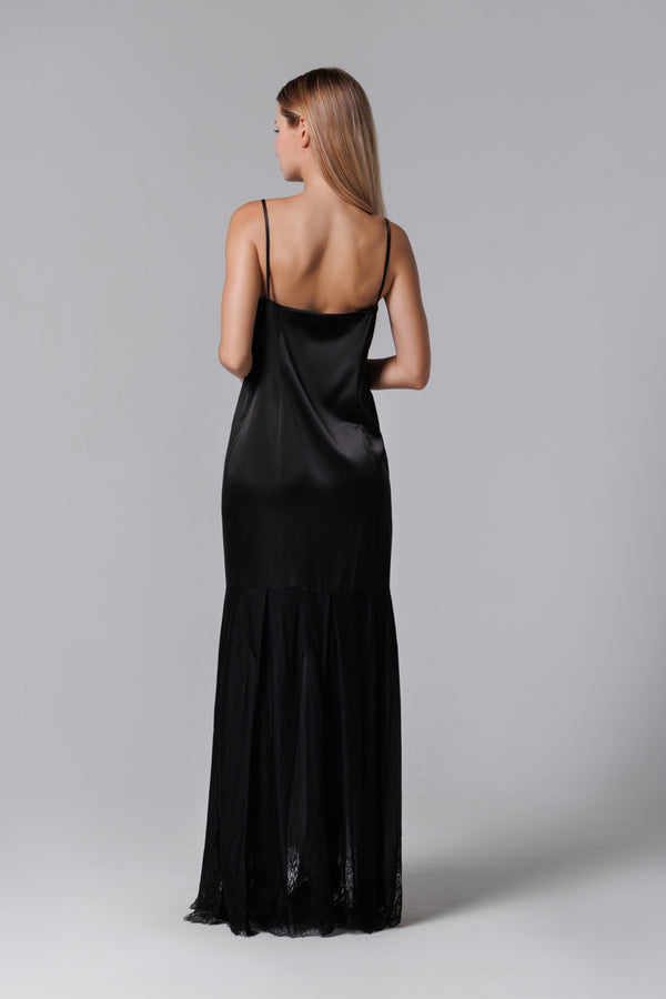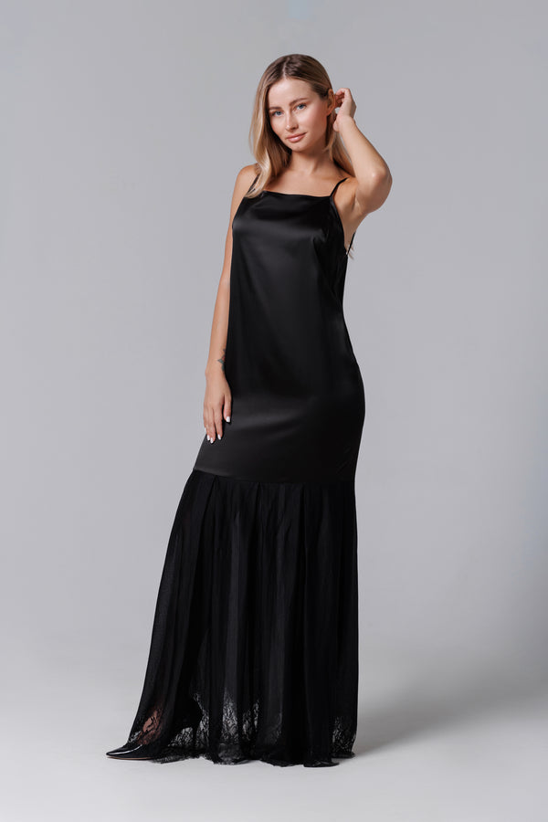 Langes schwarzes Kleid aus Satin und französischer Spitze