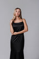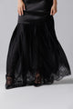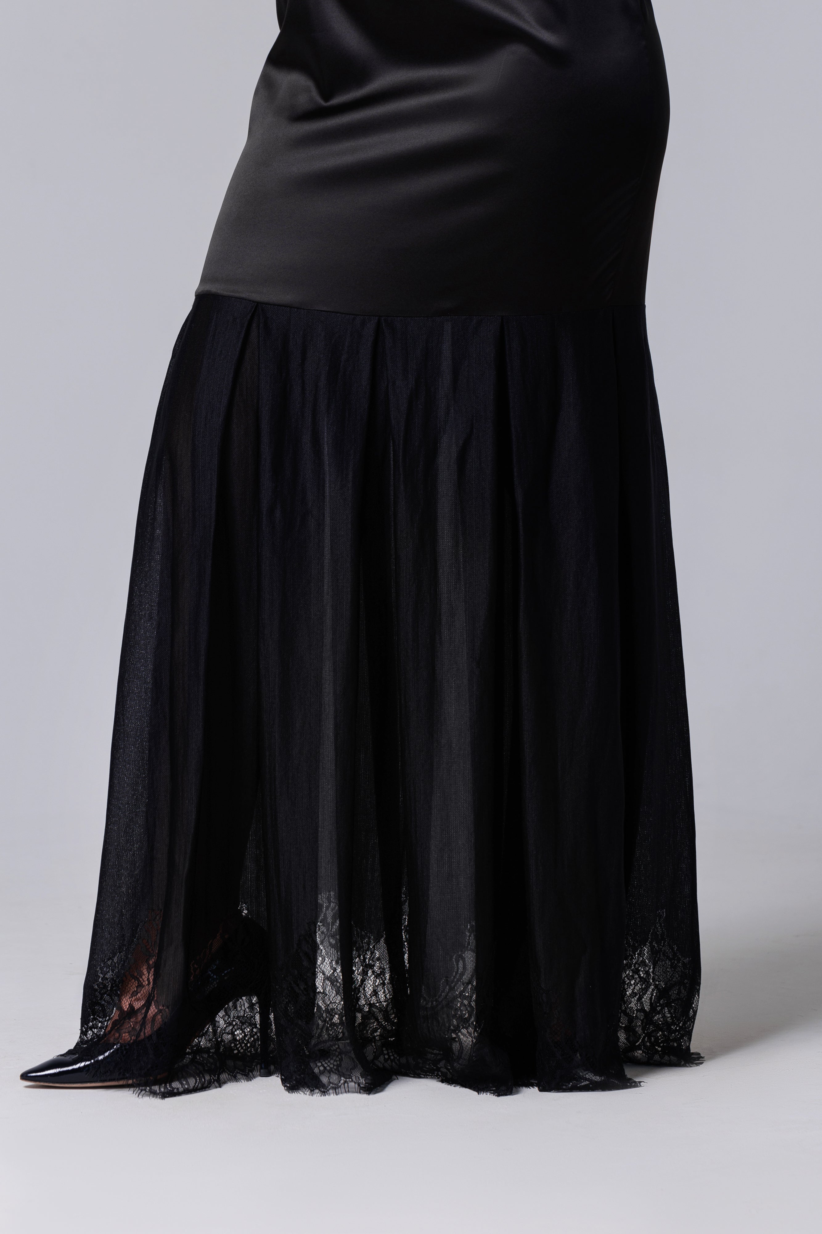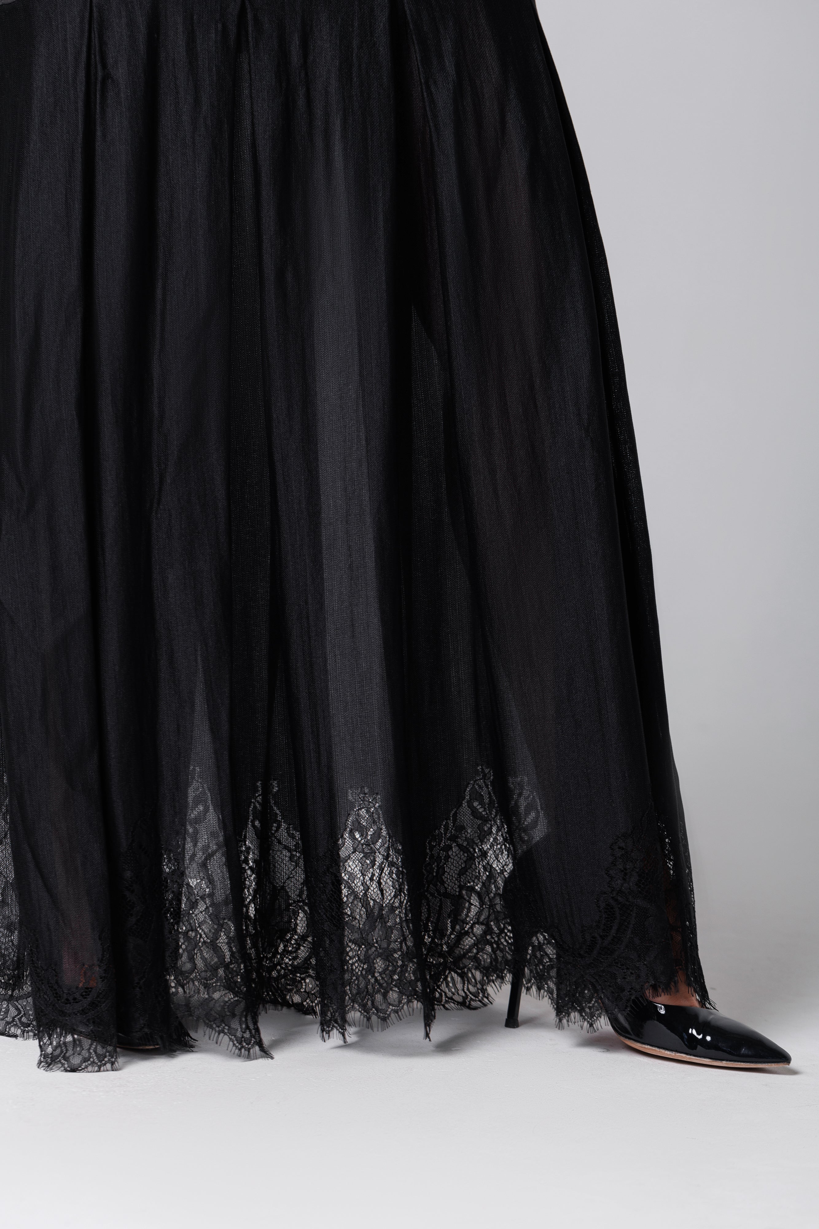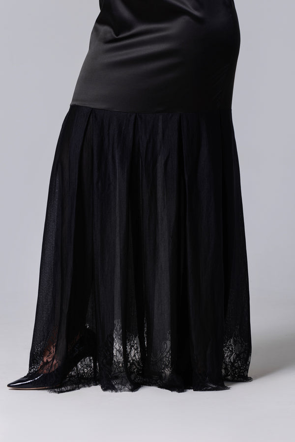 Langes schwarzes Kleid aus Satin und französischer Spitze