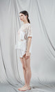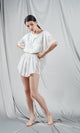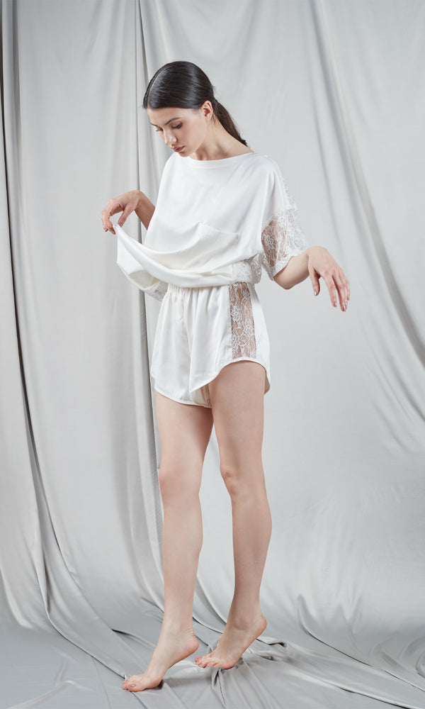 Shorts aus elfenbeinfarbenem Satin mit Gummizug in der Taille für Komfort und eine flexible Passform. Das minimalistische und luxuriöse Design dieser Shorts macht sie vielseitig einsetzbar, geeignet für die Entspannung zu Hause oder als Teil eines stilvollen Pyjama-Sets. Die Spitzenverzierung setzt einen zarten Akzent und unterstreicht die hohe Qualität und die anspruchsvolle Ästhetik des Designs