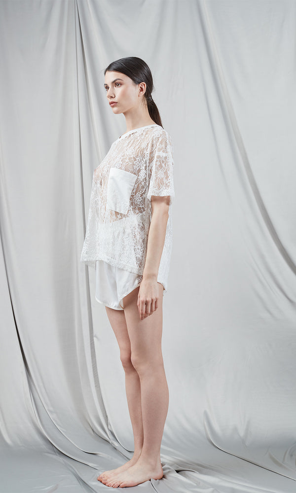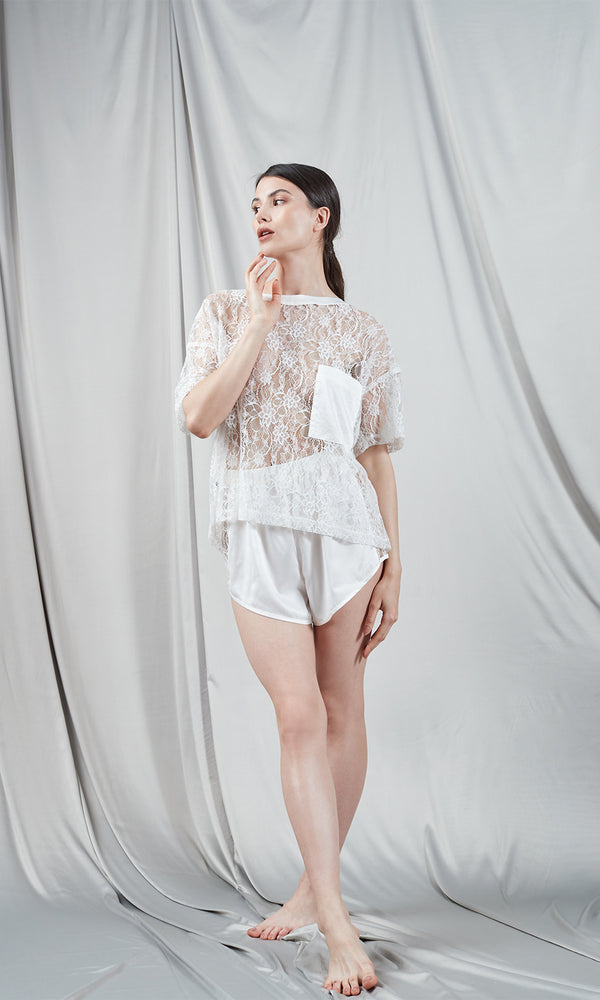 Exquisites weißes T-Shirt aus hochwertigem Satin mit einer auffälligen Fronttasche aus Satinmaterial, die einen eleganten Kontrast zum Rest des Stücks bildet. Das Design zeichnet sich durch einen schlichten, kurzärmeligen Schnitt aus, der durch ein gewagtes Detail aus durchsichtiger Spitze ergänzt wird und einen zarten und femininen Touch verleiht. Es verleiht einen Hauch von Raffinesse und Vielseitigkeit und kann in einer Vielzahl von Kombinationen getragen werden, von legeren bis hin zu eleganten Abend-Ensembles